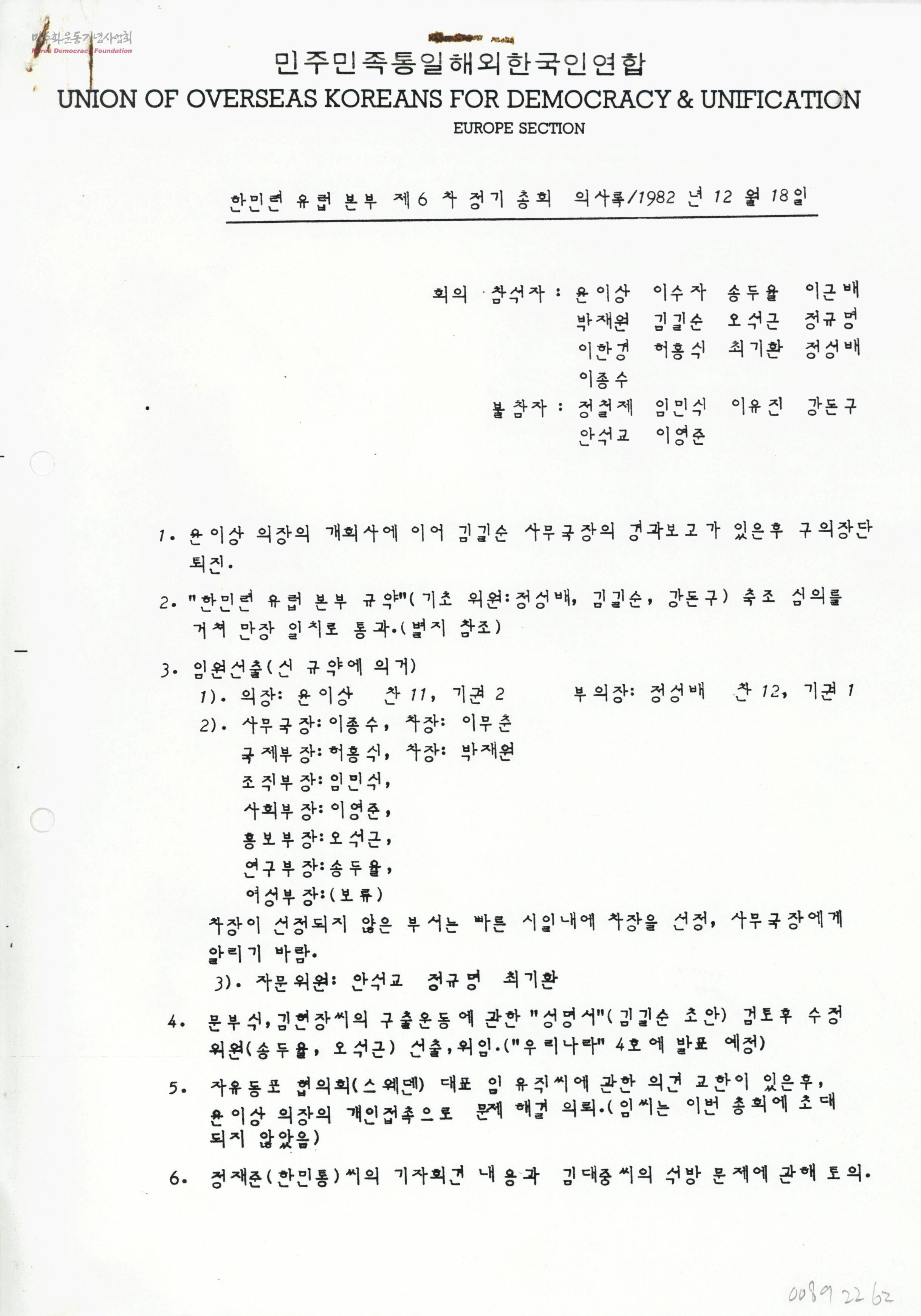 - 1982년 12월 18일에 있었던 한민련 유럽본부 제6차 정기총회 의사록 개회사, 경과보고, 구의장단 퇴진 한민련 유럽본부 규약 축조심의를 거쳐 만장일치 통과 임원설출 문부장, 김현장씨 구출운동에 관한 성명서 검토, 수정위원 선출, 위임 자유동포협의회(스웨덴) 대표 임유직에 관한 의견교환 김대중석방문제 토의 동경 한민련 총회 윤이상 의장, 정성배 부의장, 이종수 사무국장 참가 사업계획