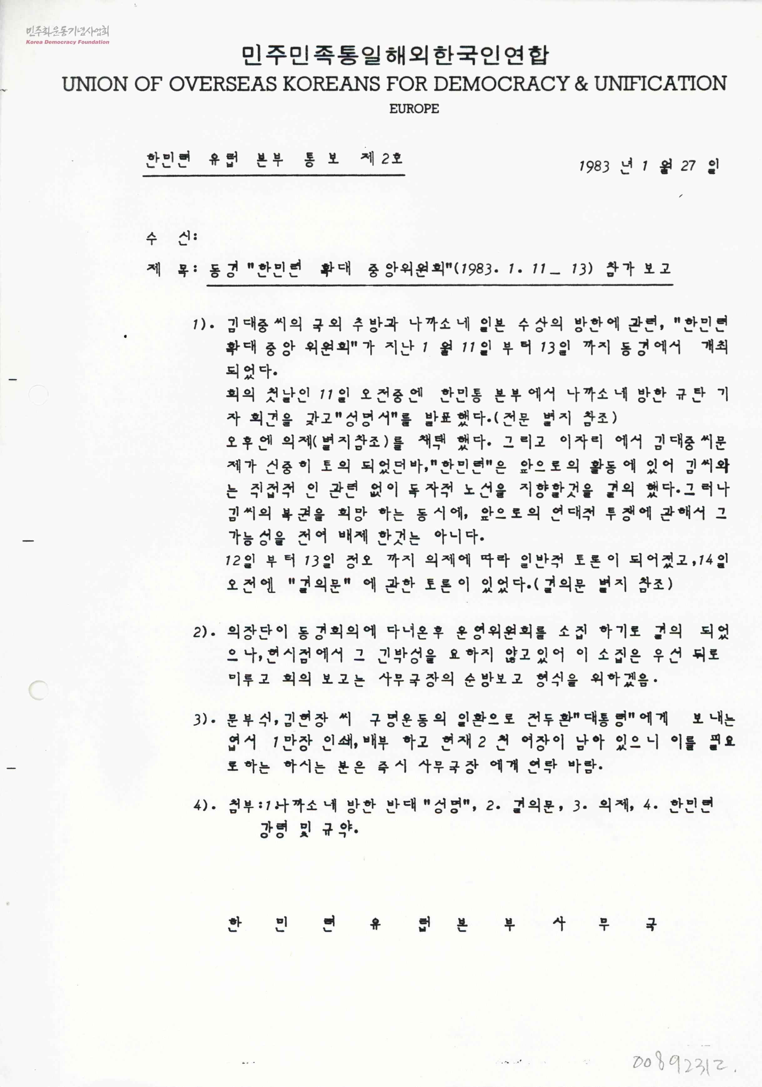 - 김대중씨의 국외 추방과 나까소네 일본 수상의 방한에 관련하여 개최된 "한민련 확대 중앙위원회"(1월 11-13일)참가보고서