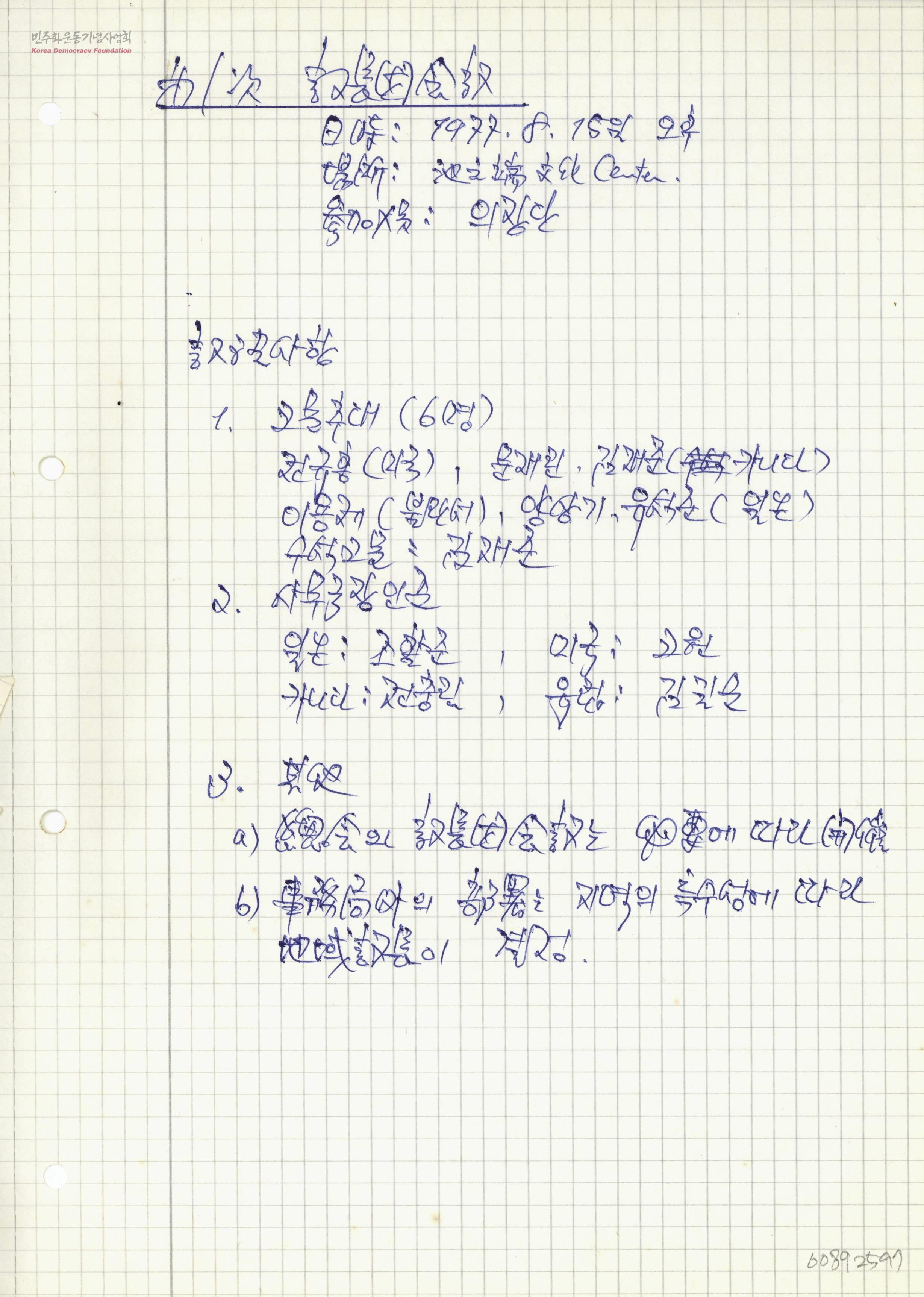 - 1977년 8월 15일 민주민족통일해외한국인연합 제1차 의장단 회의내용기록 의결사항: 고문추대, 사무국장 인준, 기타