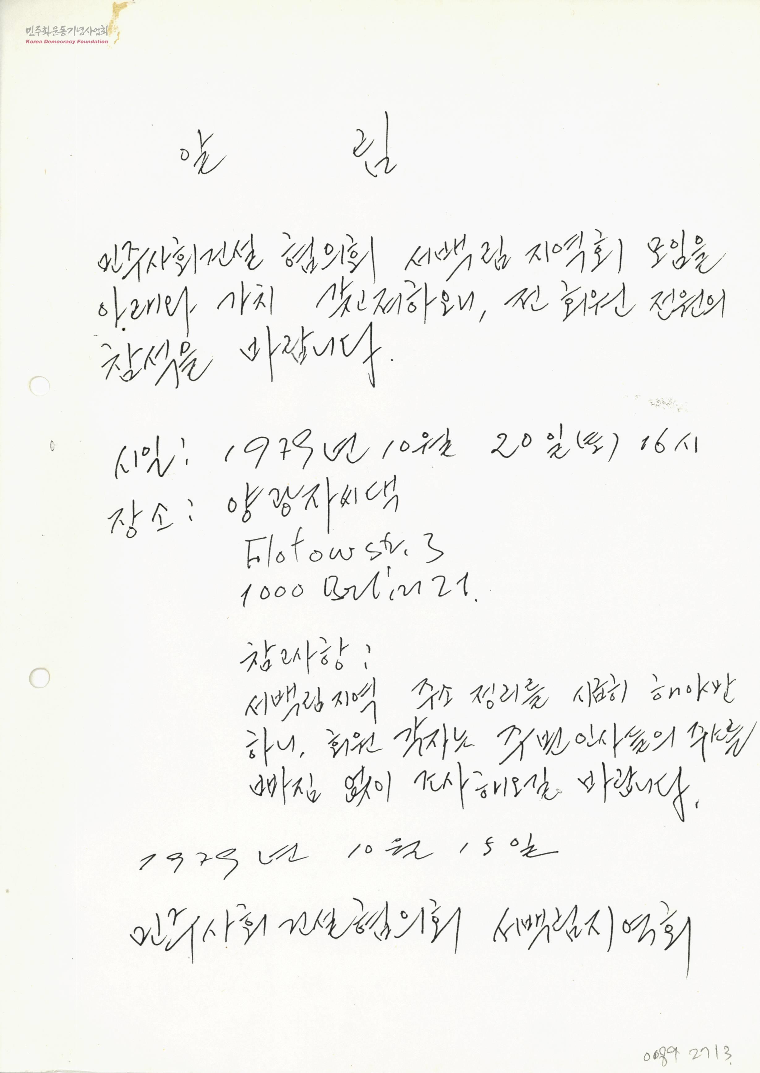 - 민주사회건설협의회 서백림지역회 모임 안내문서 일시 1979년 10월 20일