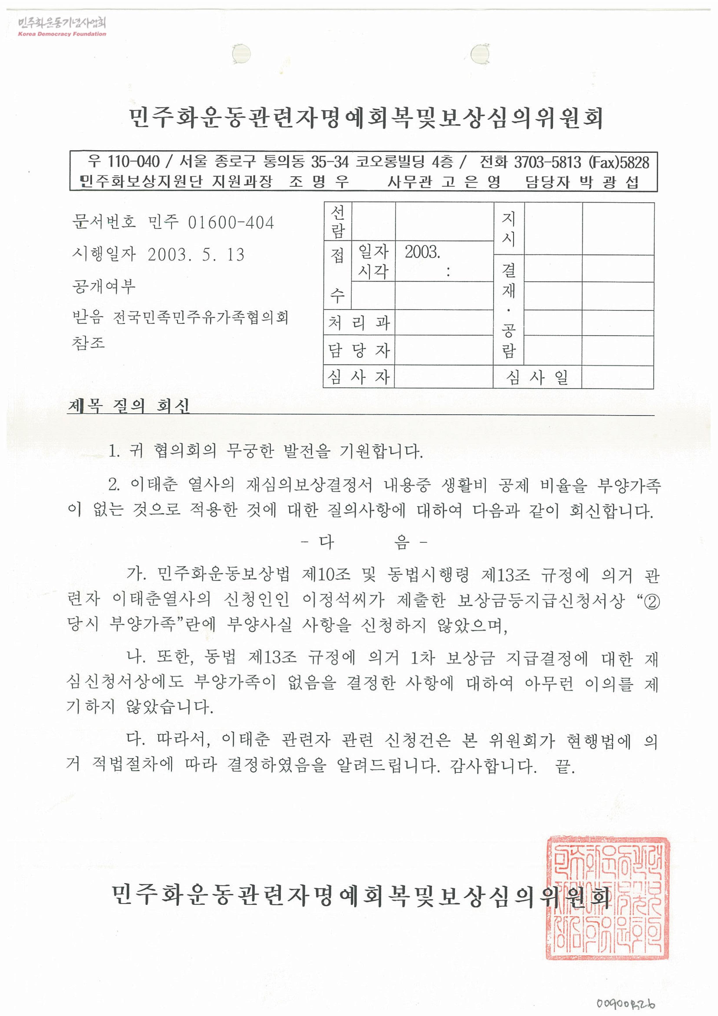 질의 회신[수신:전국민족민주유가족협의회,발신:민주화운동관련자명예회복및보상심의위원회]