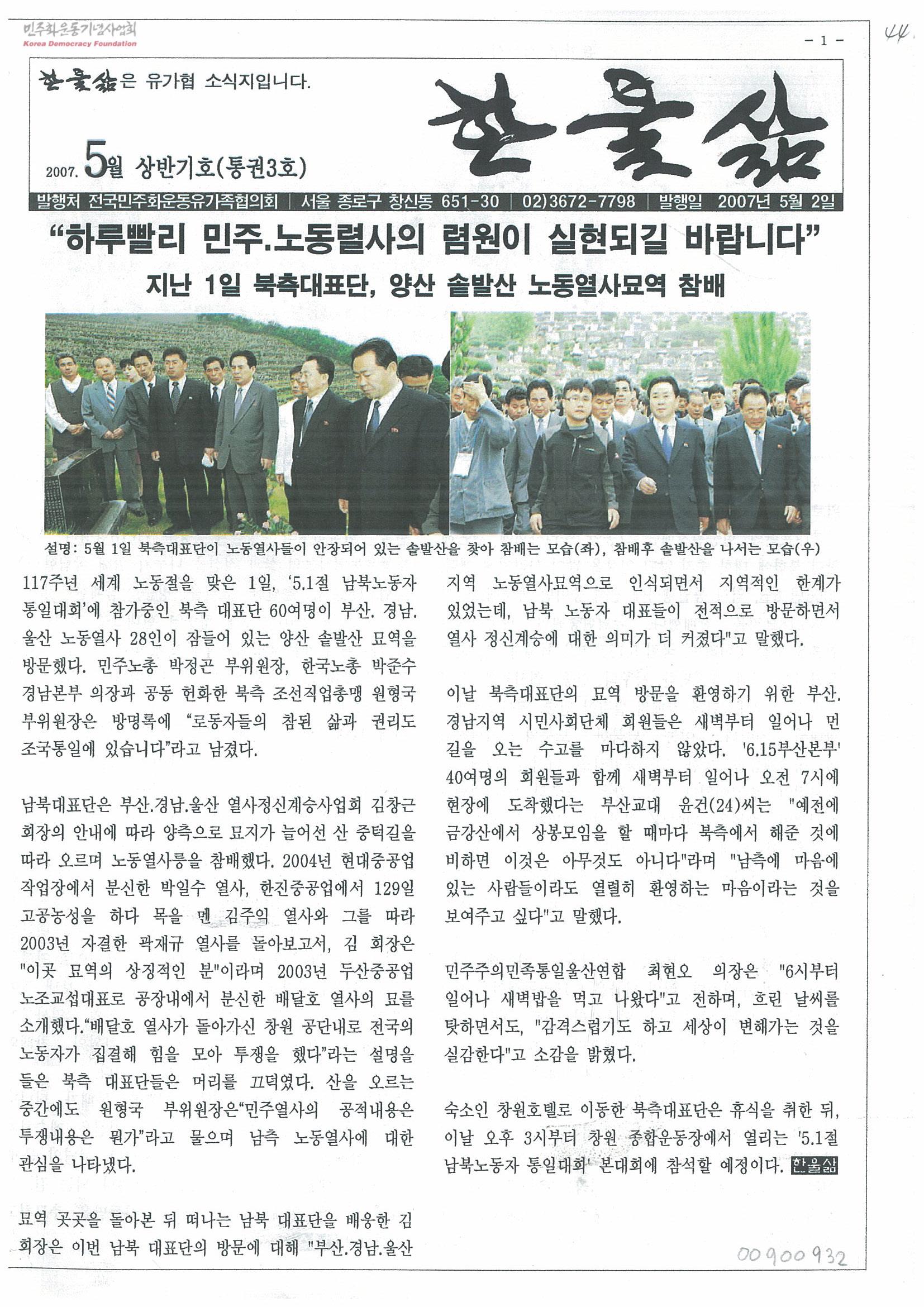 - 이야기 : 이북의 묘지참배와 남북화해 한울삶 소식 : 사진으로 보는 활동과 일정공지 소식: 광주 민주공원 설명회 이달의 역사 : 노동절(메이데이) 논단 : 공소시효 특례법 국가범죄 해결의 길 소식 : 연대단체 소식 기타 : 사진으로 말하기 공지 : 황규남회원(이재식 부인) 장녀 이근혜 시집갑니다!