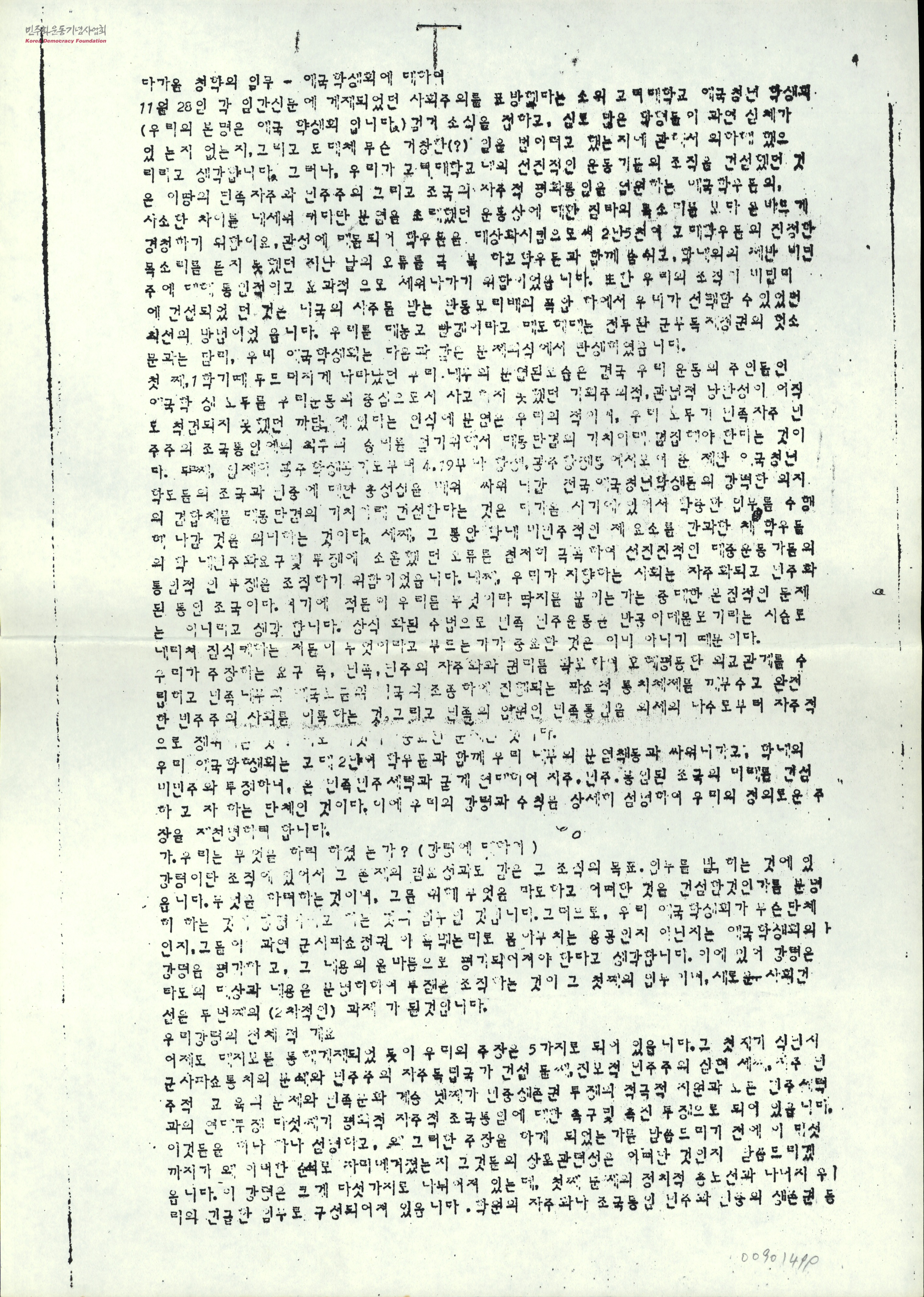- 고려대학교 애국학생회의 강령의 전체적 개요로, 첫째, 식민지 군사파쇼통치의 분쇄와 민주주의 자주독립국가 건설, 둘째, 진보적 민주주의 실현, 셋째,자주민주적 교육의 문제와 민족문화계승, 넷째, 민중생존권 투쟁의 적극적 지원과 모든 민주세력과의 연대투쟁, 다섯째, 평화적 자주적 조국통일에 대한 촉구 및 촉진 투쟁으로 되어 있다.