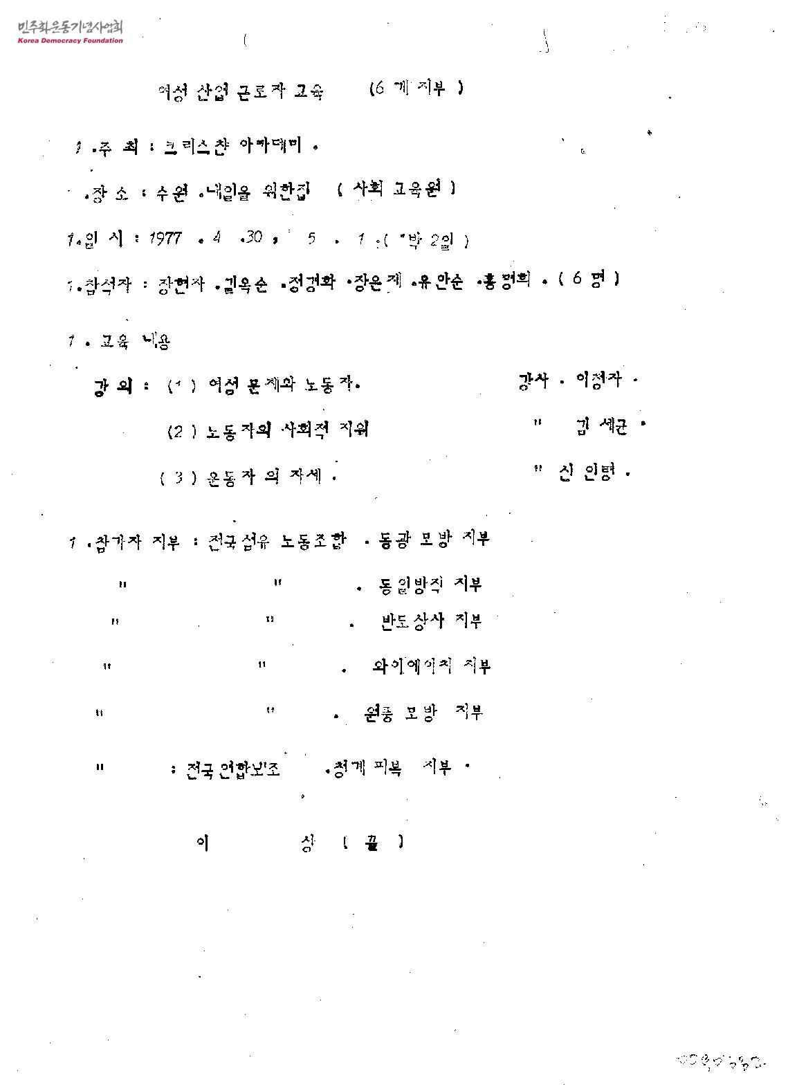 - 일시:1977.4.30~5.1(1박2일) 장소: 수원, 내일을 위한집(사회교육원) 교육 내용: 1) 여성문제와 노동자 2) 노동자의 사회적 지위 3) 운동자의 자세