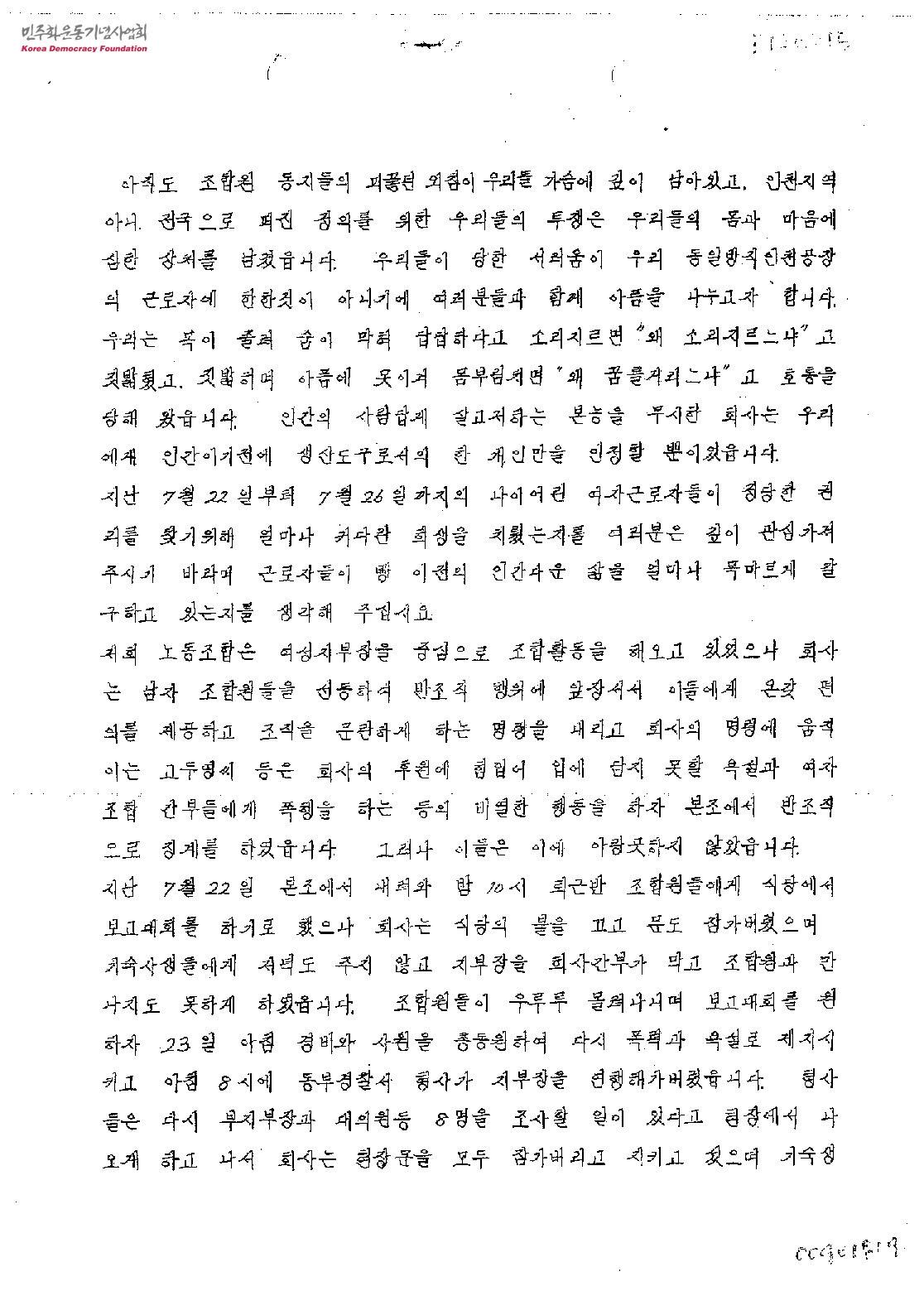 - 동일방직 여성 노동자들의 민주노조 건설과 관련하여 회사 측의 탄압에 대해 고발하며 관련 재판에 관심을 가져줄 것을 호소하는 내용이다.