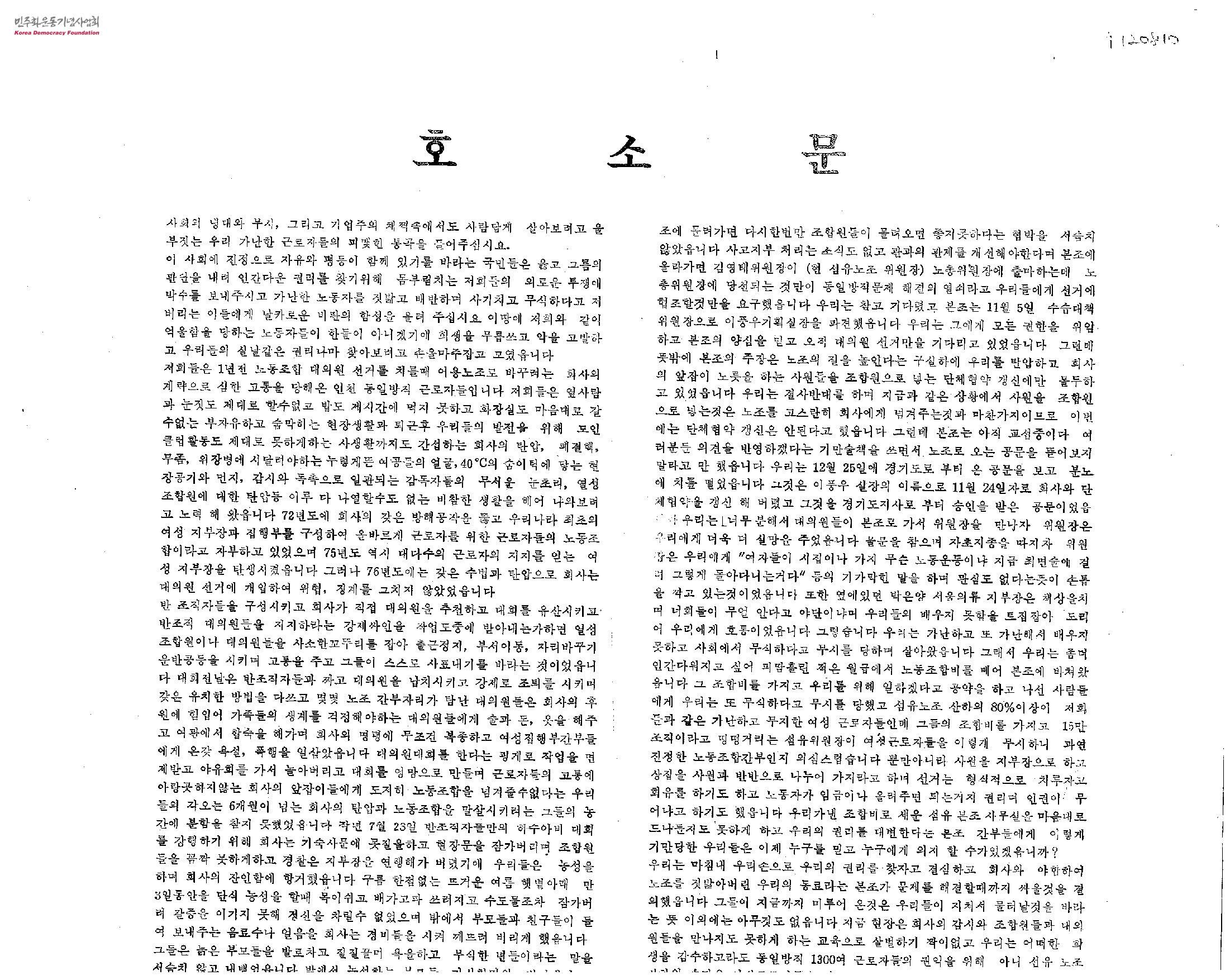 호소문[동일방직 사고지부 수습 관련]