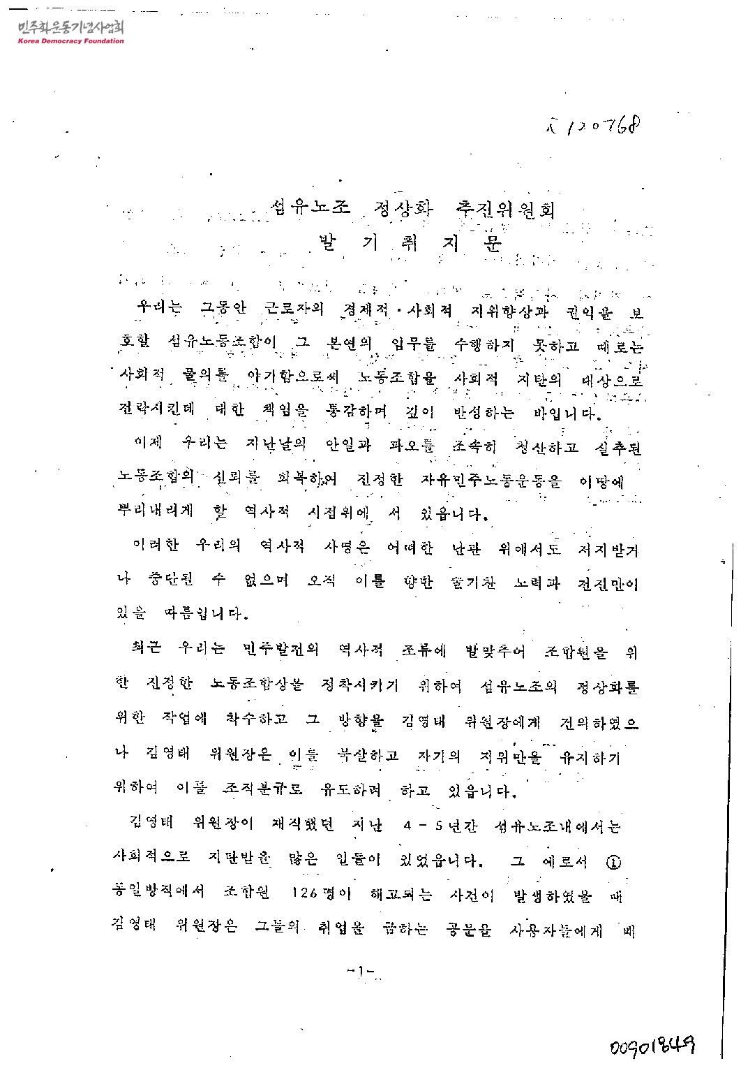 - 김영태 섬유노조 위원장의 비민주적 조직 운영과 노조의 사회적 신뢰 및 공신력 실추 등에 대한 문제를 해결하고자 섬유노조 정상화 추진위원회를 구성한다는 내용이 수록되어 있다.