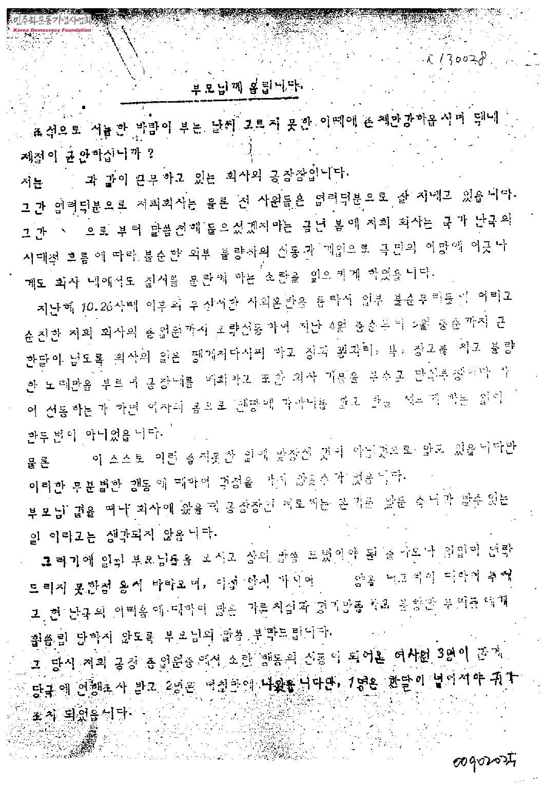 - 반도상사 부평공장 공장장이 근로자 부모님에게 보내는 편지로 해당 근로자의 이름은 공란처리되어 있으며 해당 근로자에 대한 선도를 당부하는 내용으로 이뤄져 있다.