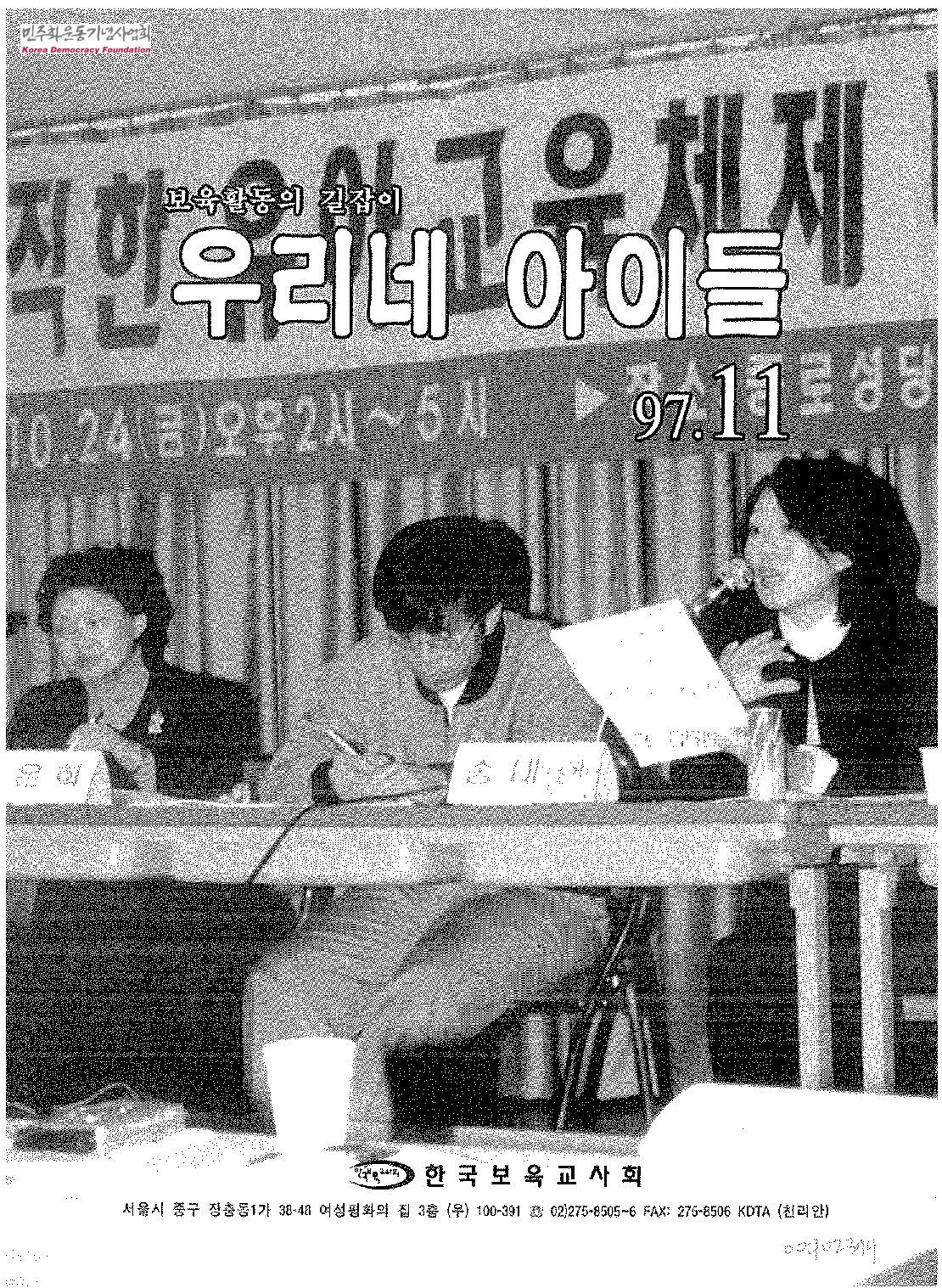- 목차 일하며 생각하며- 꿈을 향해 전진하는 이들 보육정책(1)- 15대 대통령이 이행해야 할 보육정책과제 보육정책(2)- 한국 유아교육체제 마련을 위한 제고찰 현장스케치- 바람직한 유아교육체제 마련을 위한 토론회를 다녀와서 보육의 질- 서울시 민간가정보육시설 유아보육프로그램 질분석 통합보육- 통합보육의 효과 어린이건강- 이유식 먹이기 영양과 건강- 질환별 영양관리(2) 교사의 의견-보육교사는 국고지원의 재교육을 원한다 현장소식-둥근나라어린이집이 동네 노인잔치를 했답니다 북한어린이를 생각하는 주감어린이집 작은 음악회 '97 인천 보육교사회 가을운동회 어린이와 그램책 강좌를 열고서 좋은 그림책 소개- 우리끼리 가자, 들짐승의 겨울나기 소모임소개- 건강교사소모임 현장교육- 풍물굿 배우기 육아일기- 유빈이는 무쇠가 아니예요 꽁트- 너무 슬픈 어느 가을날 세상읽기- 퍼스트레이디의 희망을 위하여? 오사카에서 온 편지- 제15회 이크노문화제 탁아소별곡- 근로복지공단 안산어린이집에서 생긴 일 우리들의 목소리-야마가타 기록영화제가 주는 메시지 보육계풍향 소식과 소식 편집부에서