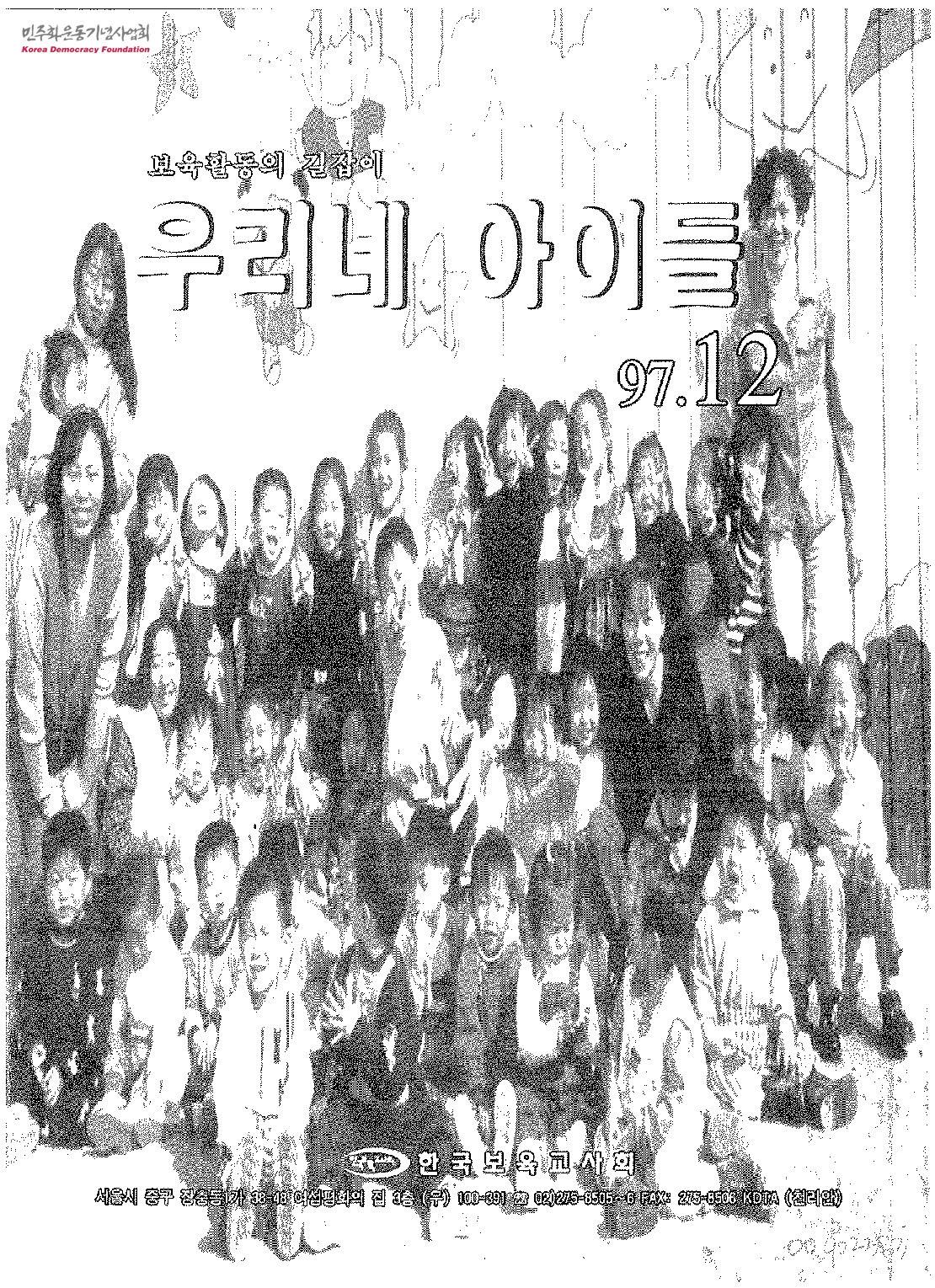 - 목차 일하며 생각하며- 희망찬 미래의 그림을 그리기 위해 기획(1)- '97 정기국회에서 보육과 관련되어 개정된 내용 기획(2)- 가정폭력방지법에 대해 알아봅시다 기획(3)- 대통령후보 초청 여성정책 토론회의 주요쟁점 건의문- 유아교육체제 개혁과 5세아 무상교육에 대한 건의문 다녀와서(1)- 유아교육 정책토론회를 다녀와서 보육의 질- 보육교사와 함께 개발하는 주제를 중심으로 한 보육프로그램 다녀와서(2)- 한국영유아보육학회 '97 추계학술대회 참관기 어린이와 환경- 어린이와 환경 국제학술대회 어린이건강- 어린이 설사와 경기 보고- 중간간부 훈련을 다녀와서 교통교육- 부모와 함께 하는 어린이 교통안전 소모임 소개- 아이들과 함께 즐거웁고 싶다 현장교육- 자유놀이 현장소식- 잊을 수 없는 열린 강좌 놀이사랑분과 강습회를 끝내고 좋은 그림책 소개- 저런 벌거숭이네 탁아소별곡- 우리 아이들의 나라, 우리어린이집에서 생긴 일 교사의 의견- 아이들은 바깥놀이 시설이 필요하다 육아일기- 유빈이는 김치를 좋아해 세상읽기- 또 다시 희망을 품으며 오사카에서 온 편지- 12월, 오사카에서 맞이하는 첫아기 우리들의 목소리 보육계풍향 소식과 소식 편집부에서