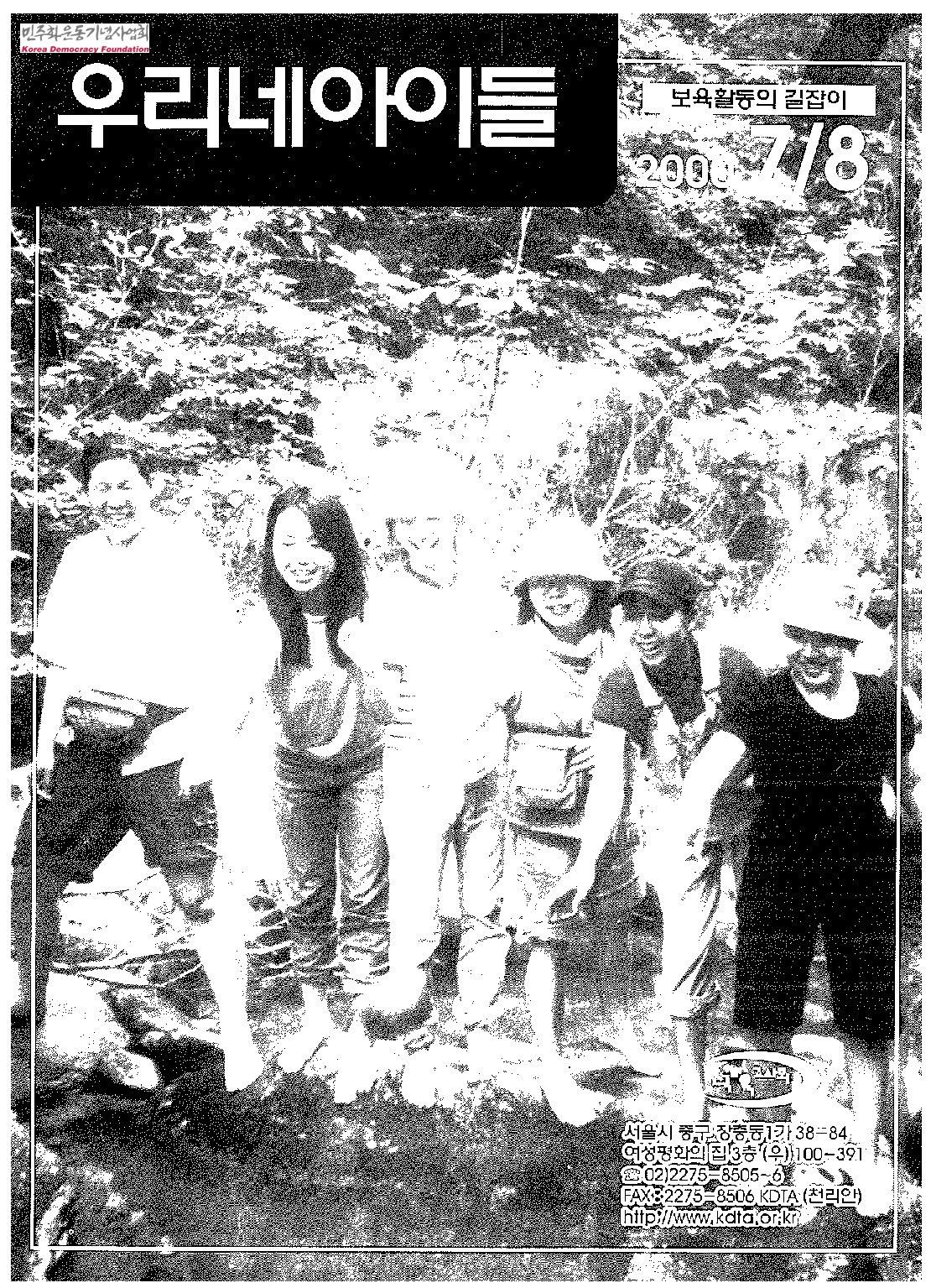 - 목차 권두언 복지정책1- 국민기초생활보장법의 이해 복지정책2- 개정된 아동복지법의 주요 내용 교육논단- 유아교육과정의 해석학적 이해 교육제안- 비장애아 중심의 장애 통합교육 프로그램 열린강좌- 여름들살이를 다녀와서 열린강좌- 여름들살이에서 보내는 작은 엽서 열린강좌- 오감살리기와 조형놀이를 다녀와서 열린강좌- 그림자로 이미지 만들기 현장교육1- 자연물을 이용한 놀이 현장교육2- 흙을 탐색해 보아요 현장소식1- 내가 만난 사람들 현장소식2- 6월 회원의 날에 현장소식3- 죽향으로의 초대 현장소식4- 제3회 인천지부 열린강좌 어린이와 건강- 여름철 발생하기 쉬운 아동 질병과 예방 인물탐방기1- 한여름, 박영미 선생님을 찾아서 인물탐방기2- 디딤 어린이집의 홍미숙 선생님 어린이집에서의 하루- 편견의 벽 앞에서 너울너울 넘나드는 아이들의 세상 만들기- 햇살어린이집 신나는반 아이들 육아일기- 나현이의 육아일기 좋은 그림책 소개- 심심해서 그랬어 쉬어가는 쪽지- 흔적 세상읽기- 반목과 불신의 끈이 끊어지고 사이버 정보망- I LOVE SCHOOL? 목소리1- 보육교사의 질을 높이기 위해서 알림난 책소개 소식과 소식 편집부에서