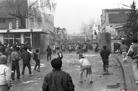 연세대 광주학살 책임 전두환 퇴진 요구 시위에서 학생들이 가두진출에 실패하고 퇴각하는 장면