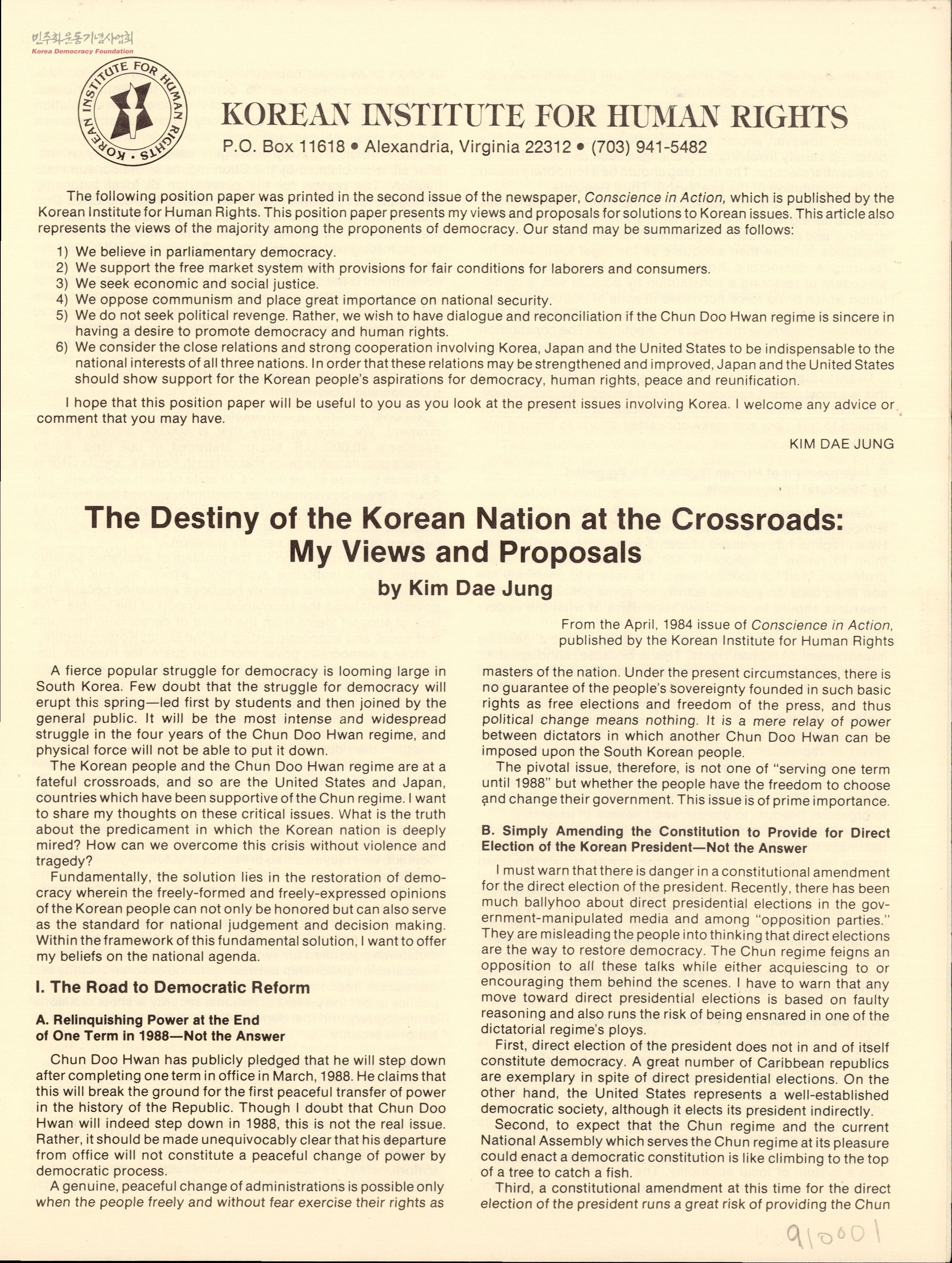- 미국 망명 중인 1984년 한국인권문제연구소 회보 기고에서 김대중이 밝힌 한국군부독재 타도방안과 민주개혁, 대중경제론, 평화통일 방안 등에 대한 정견과 향후 귀국 후 정치적 행보 피력