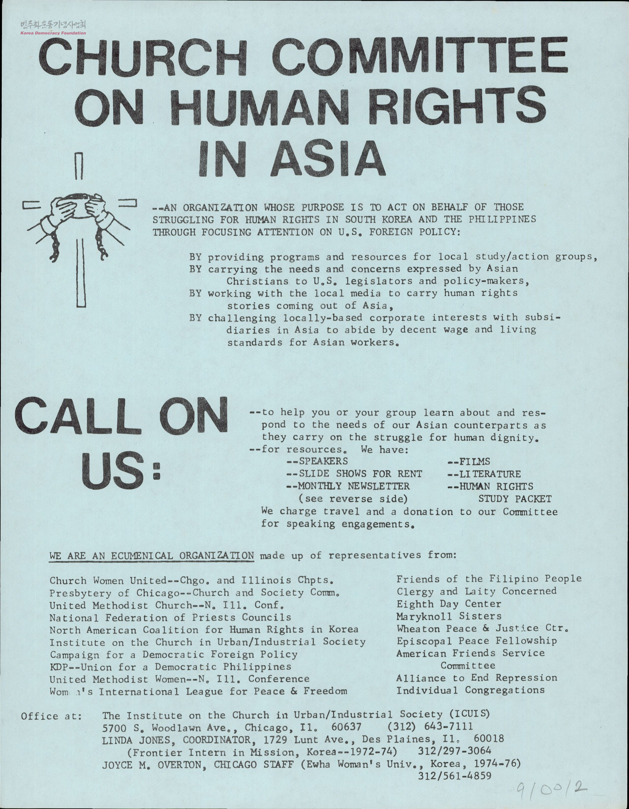 - 1. CCHRA의 목표가 한국-필리핀 중심의 제3세계 인권운동 증진에 있음. 2. 미국 및 해외 각지 에큐메니칼 조직에 소속된 후원 교단, 단체 목록 3. 민주화 인권투쟁 중인 한국과 필리핀 크리스챤에 관심있는 이들에게 도움을 제공함. 위와 같은 내용이 담긴 CCHRA 홍보 전단지.