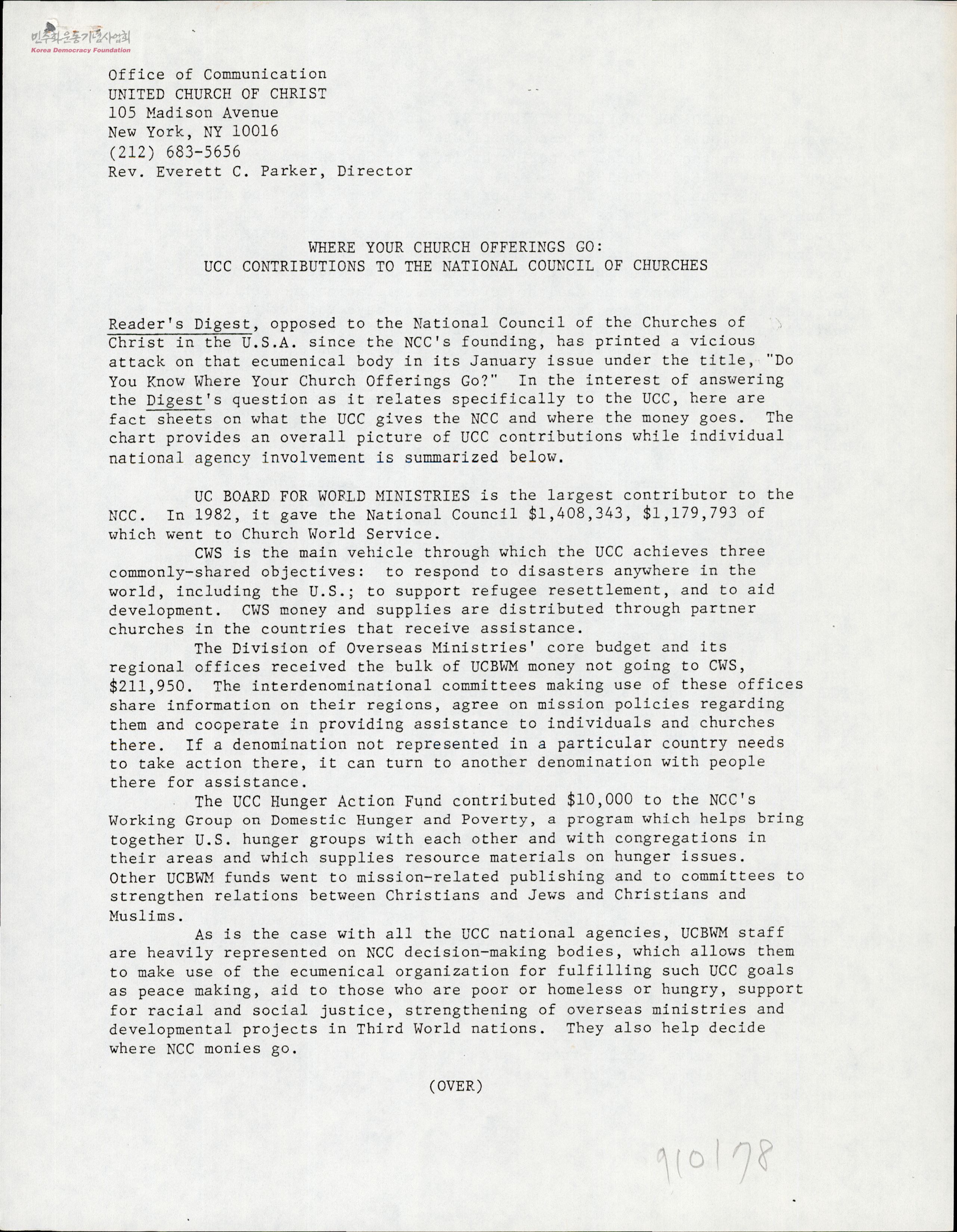 - '60 Minutes'의 NCC 의혹 제기 이후, 측면지원에 나선 보수기독잡지 '리더스 다이제스트'에 대한 비판과 헌금 사용내역 해명