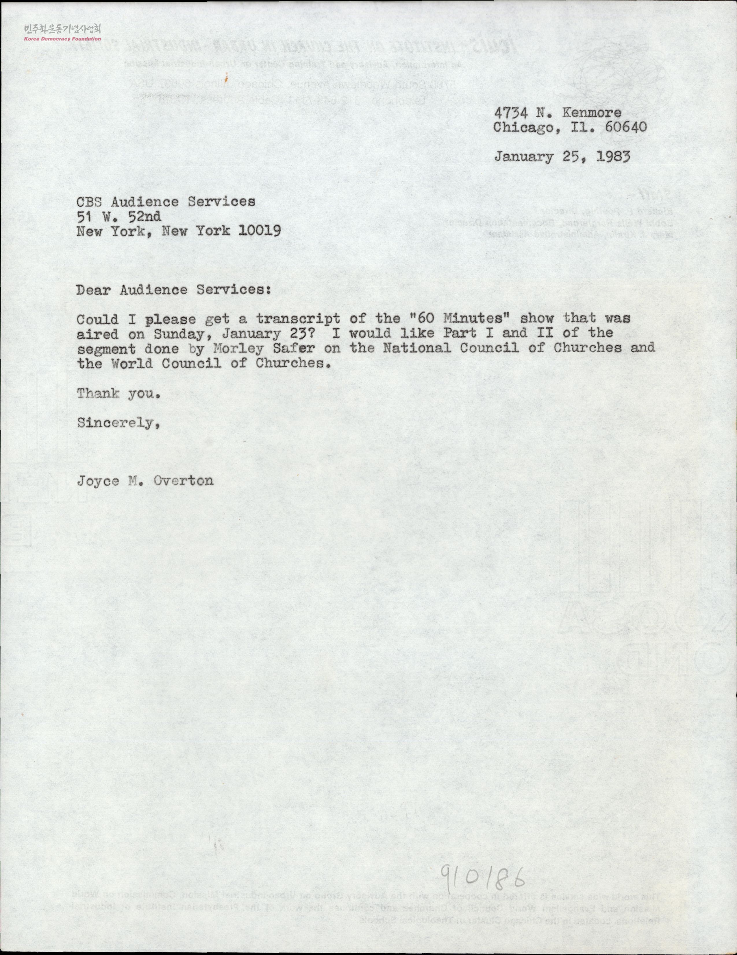 - CBS 시청자 서비스 담당에게 '60 Minutes'의 방영자료 복사본을 입수하길 원한다는 서한