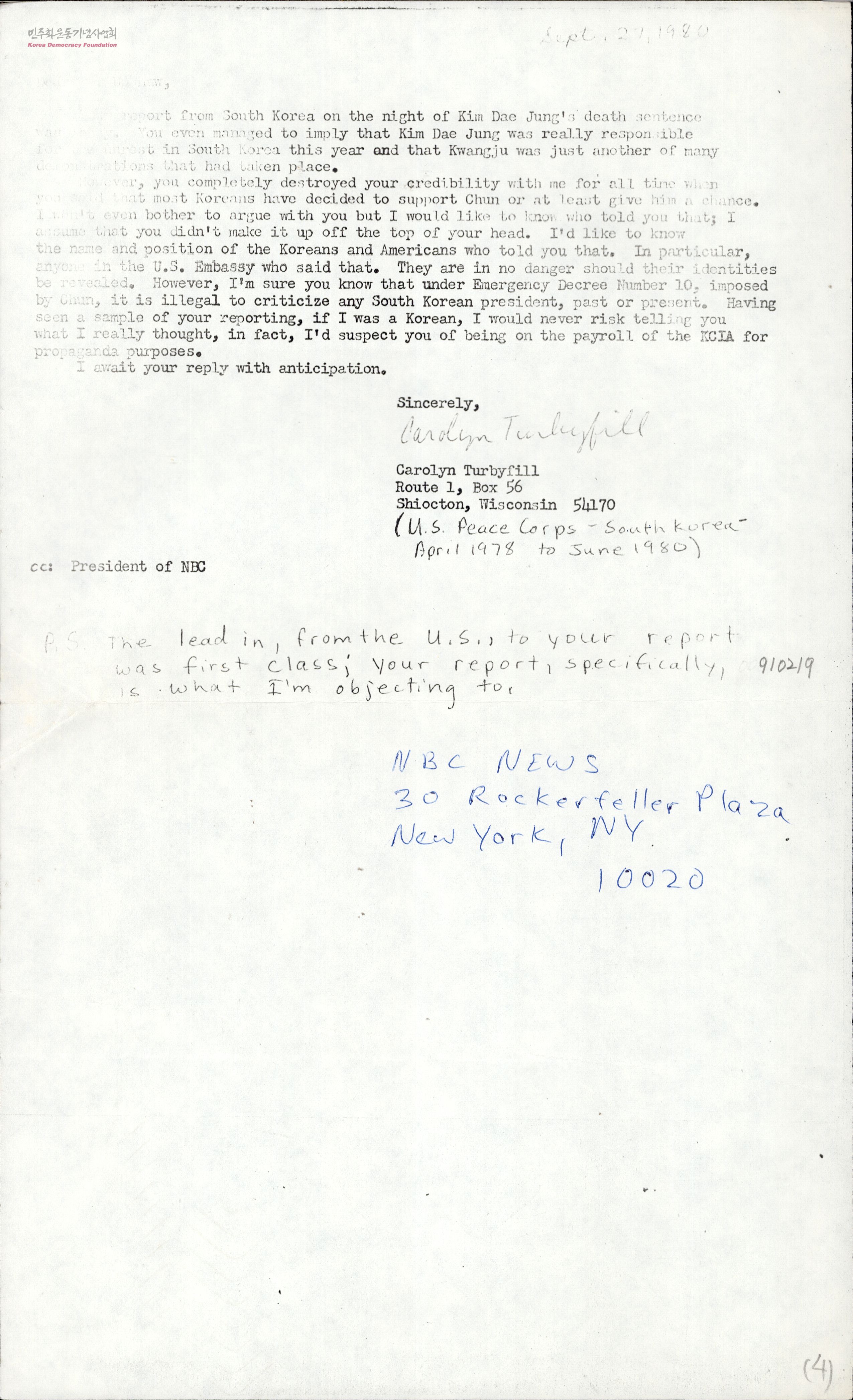 [NBC 방송이 전두환 정권의 김대중 관련 날조를 무비판적으로 보도한 데 대한 항의편지]
