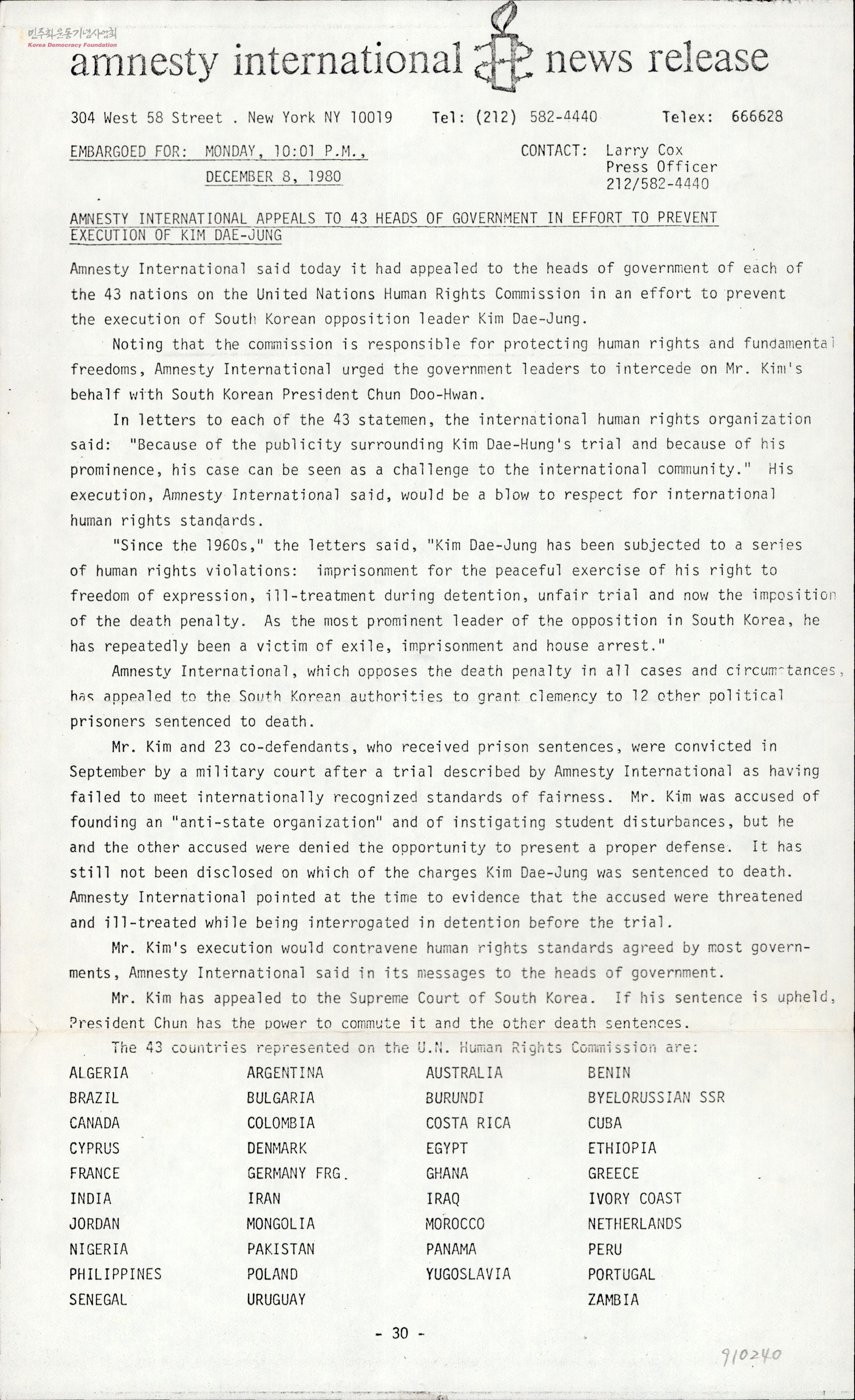 - 앰네스티가 'UN 인권협약' 가입국 43개국에 김대중 사형집행 반대 동참 호소
