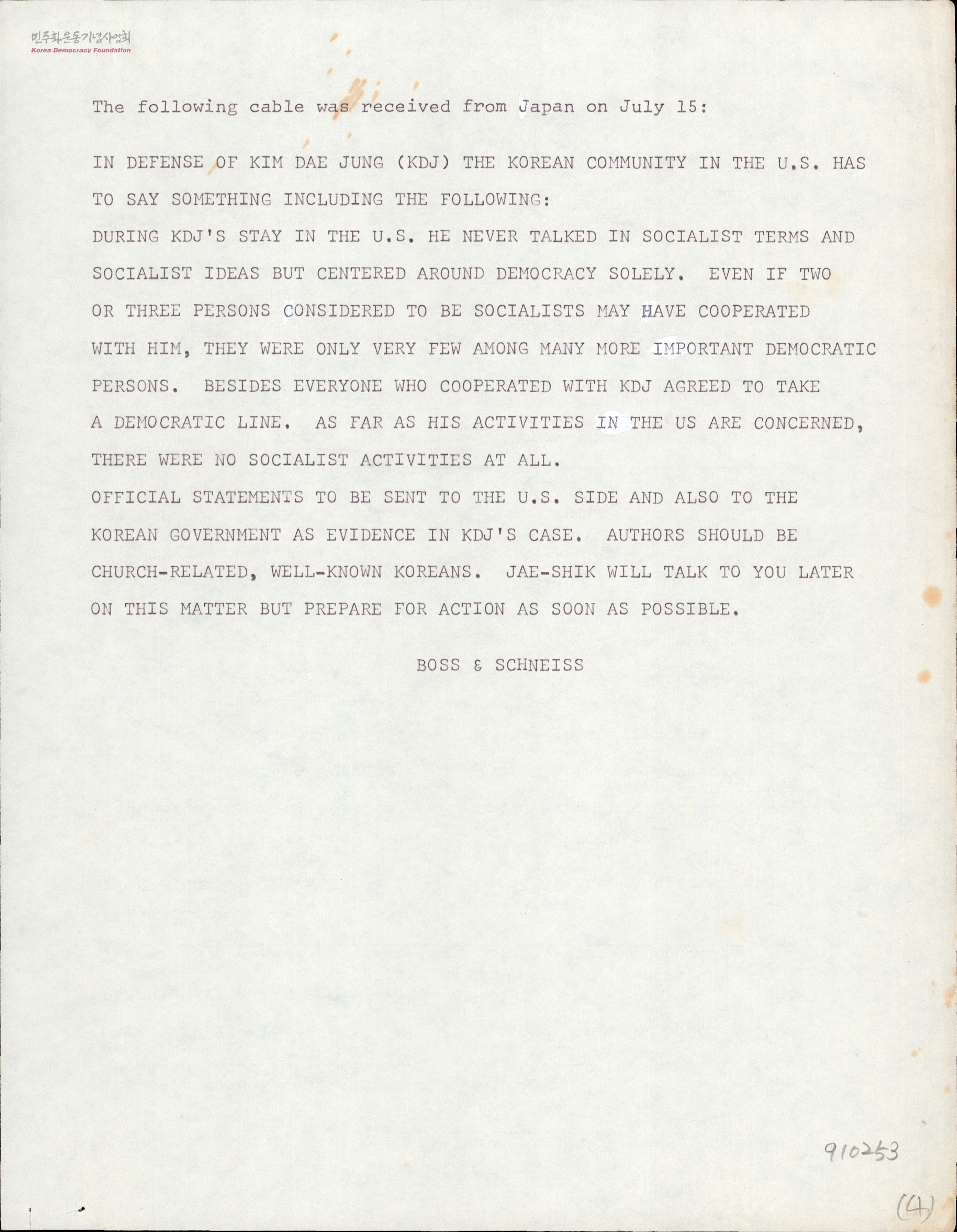 - 미국 체류기간 동안 김대중은 공산주의와 연계된 활동을 하지 않았다는 점을 강조하고, 재일단체가 미국 기독교 인권단체와 연대하여 한국 및 미국 정관계에 구명을 청원하자는 제의