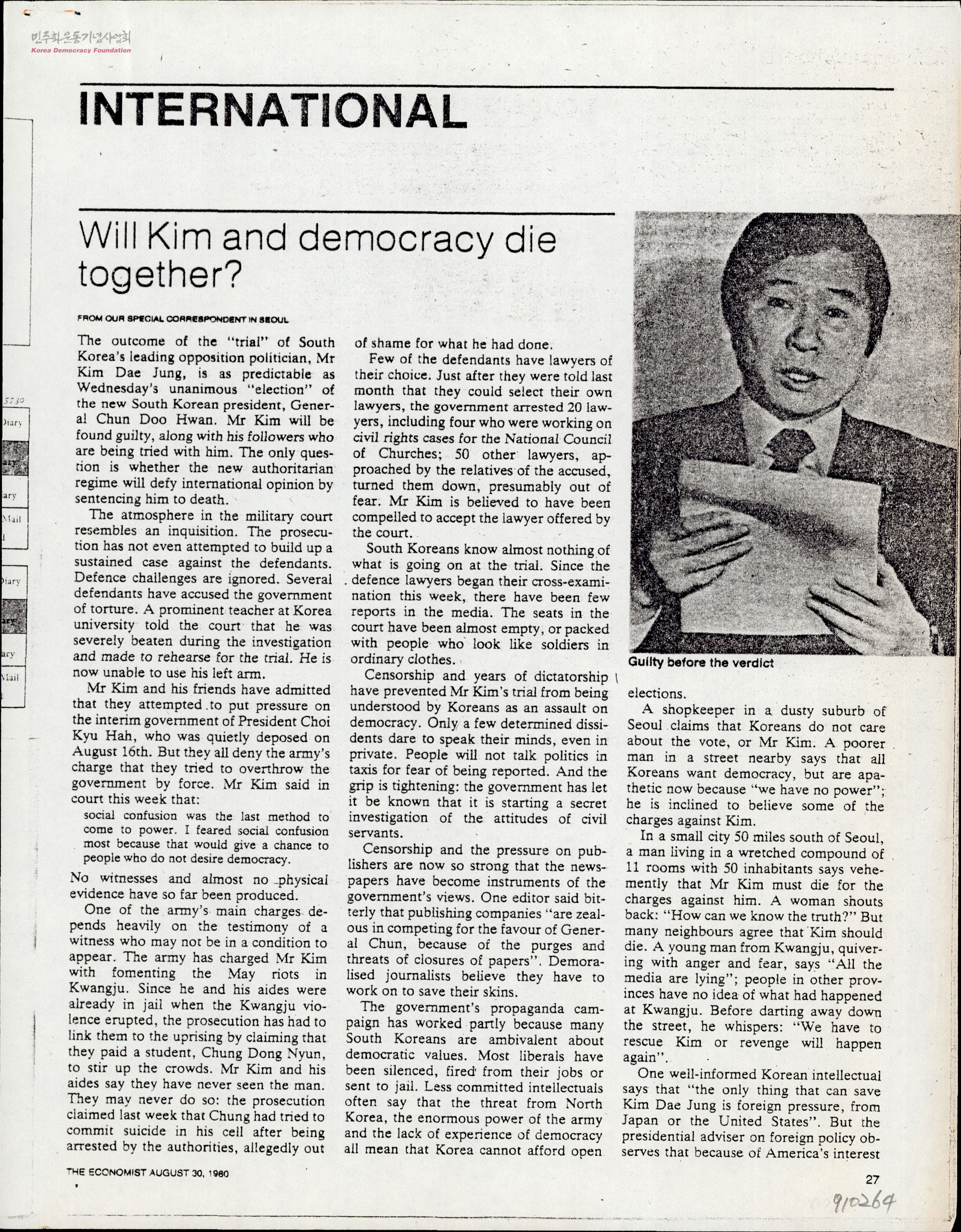 - 전두환은 '김대중 내란음모사건' 재판을 이미 '판결' 전에 '유죄'로 확정짓고 사형으로 몰고가기 위해 관련 피고인들에게 온갖 고문, 강압, 면회차단, 변호인 접견 금지 등 초강수를 두고 있으며 미-일의 반대에도 김대중의 사형은 기정사실화 되고 있다는 르포
