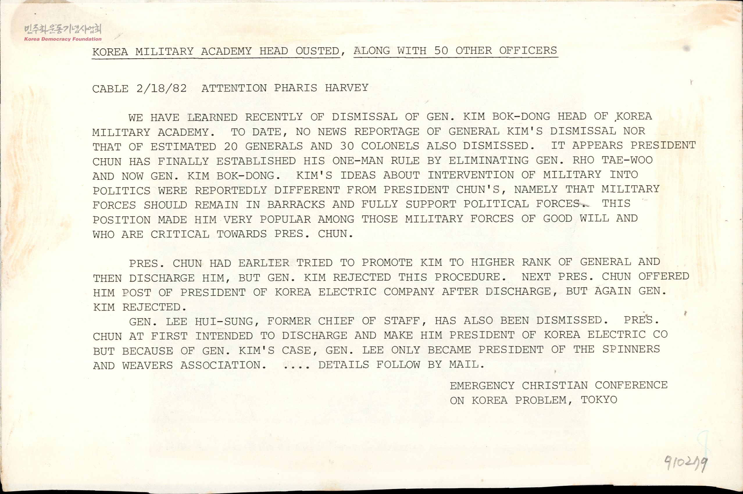 - 김복동, 이희성 등 신군부 권력 장악의 공신들이 전두환 정권에게 위협이 될 수 있다는 판단에 따라 내부적 숙청이 이루어지고 있다, 장교 숙청자가 50명을 넘어선다는 내용을 전한 전신문