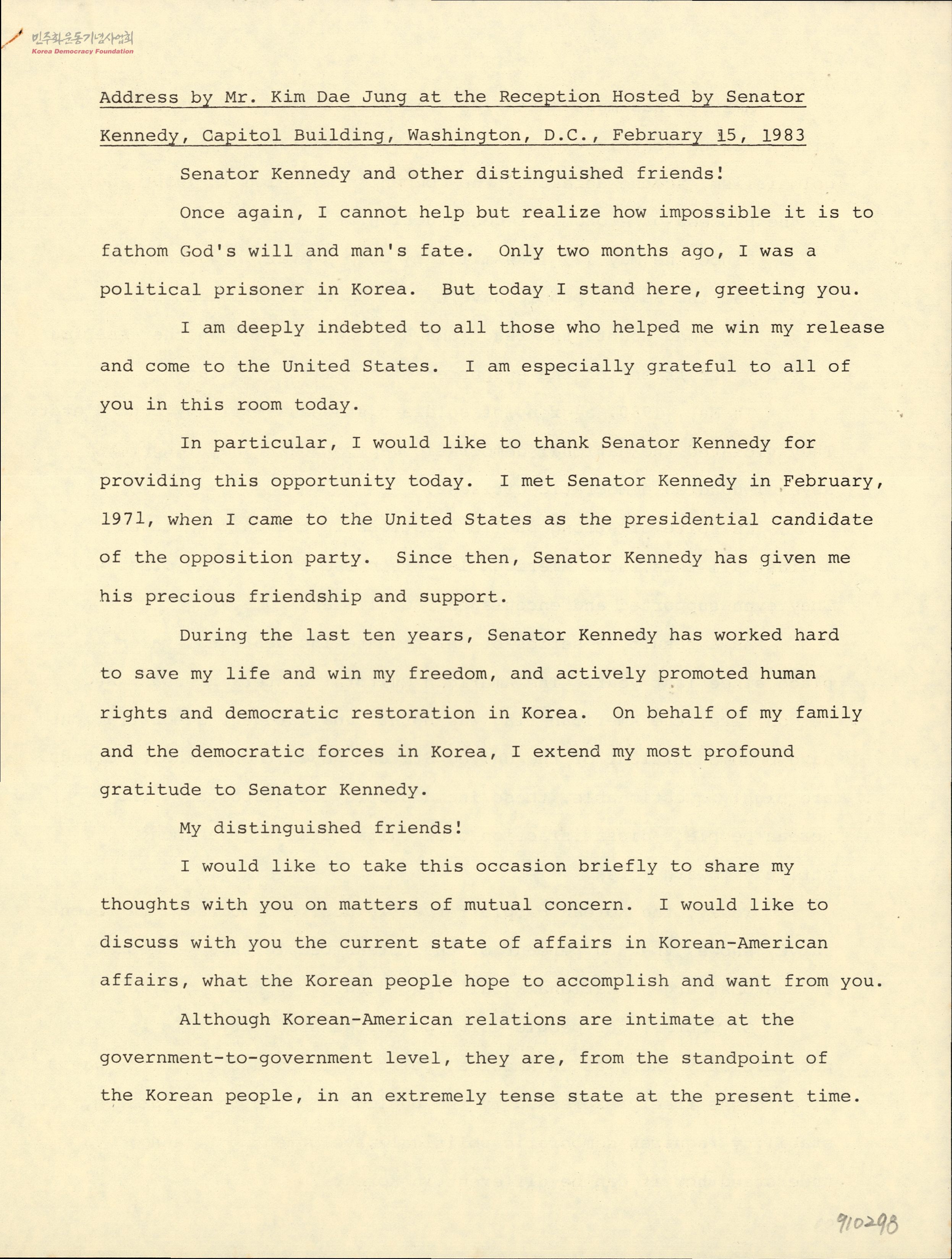 Address by Mr. Kim Dae Jung at the Reception Hosted by Senator Kennedy, Capitol Building, Washington, D.C., February 15, 1983