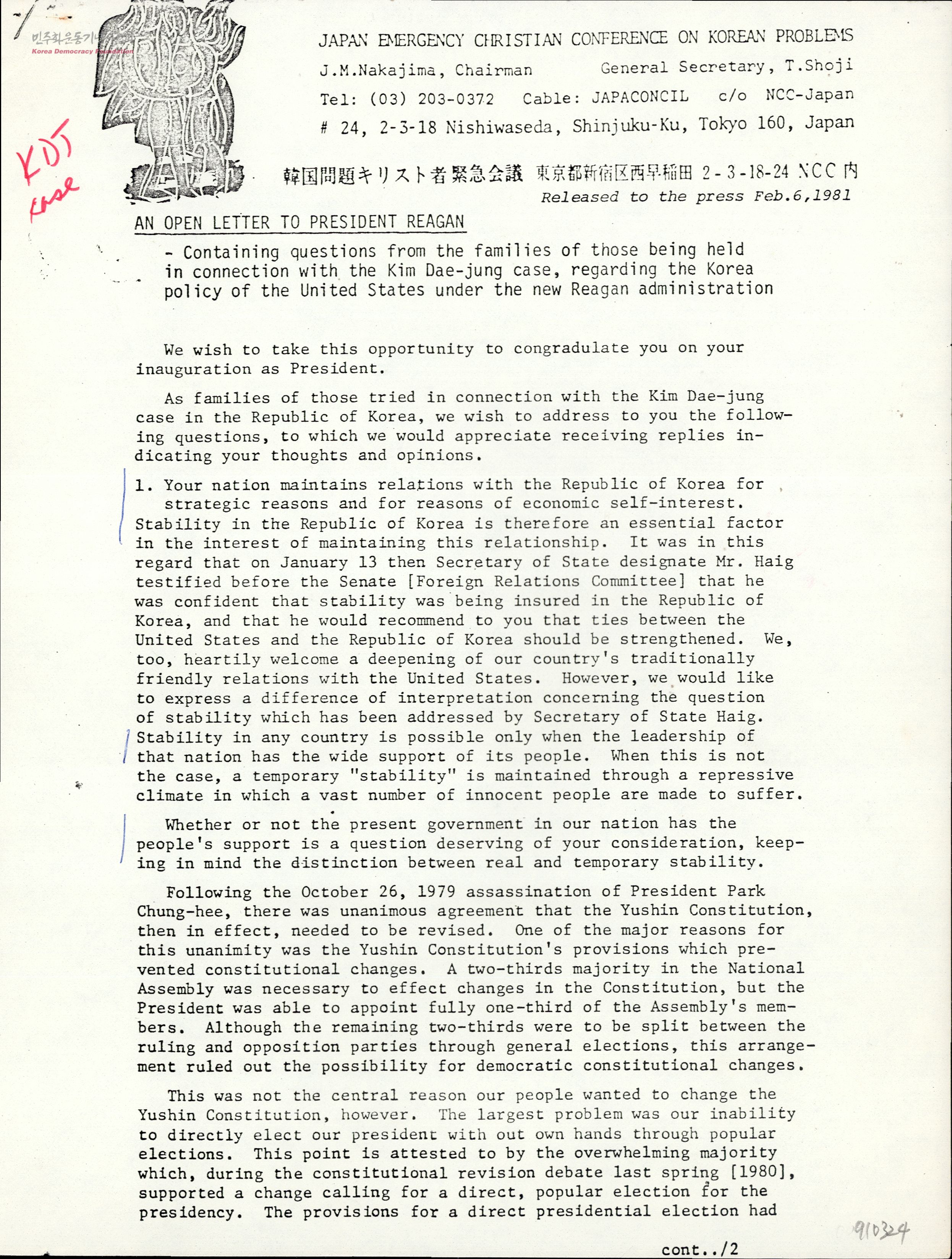 - - 레이건 미국 대통령께 드리는 공개서한 영역본으로, 김대중 구명을 위한 일본 크리스트 긴급회의가 발표 - 1981년 1월 13일, 갓 취임한 레이건 행정부의 국무장관 헤이그가 한미 관계에 있어서 안보만을 강조하고 그 연장선상에서 전두환 방미를 허용하겠다고 발언하자, 민주화 외면과 독재정권 지원이 결코 안보에 도움이 될 수 없다는 논리로 반박