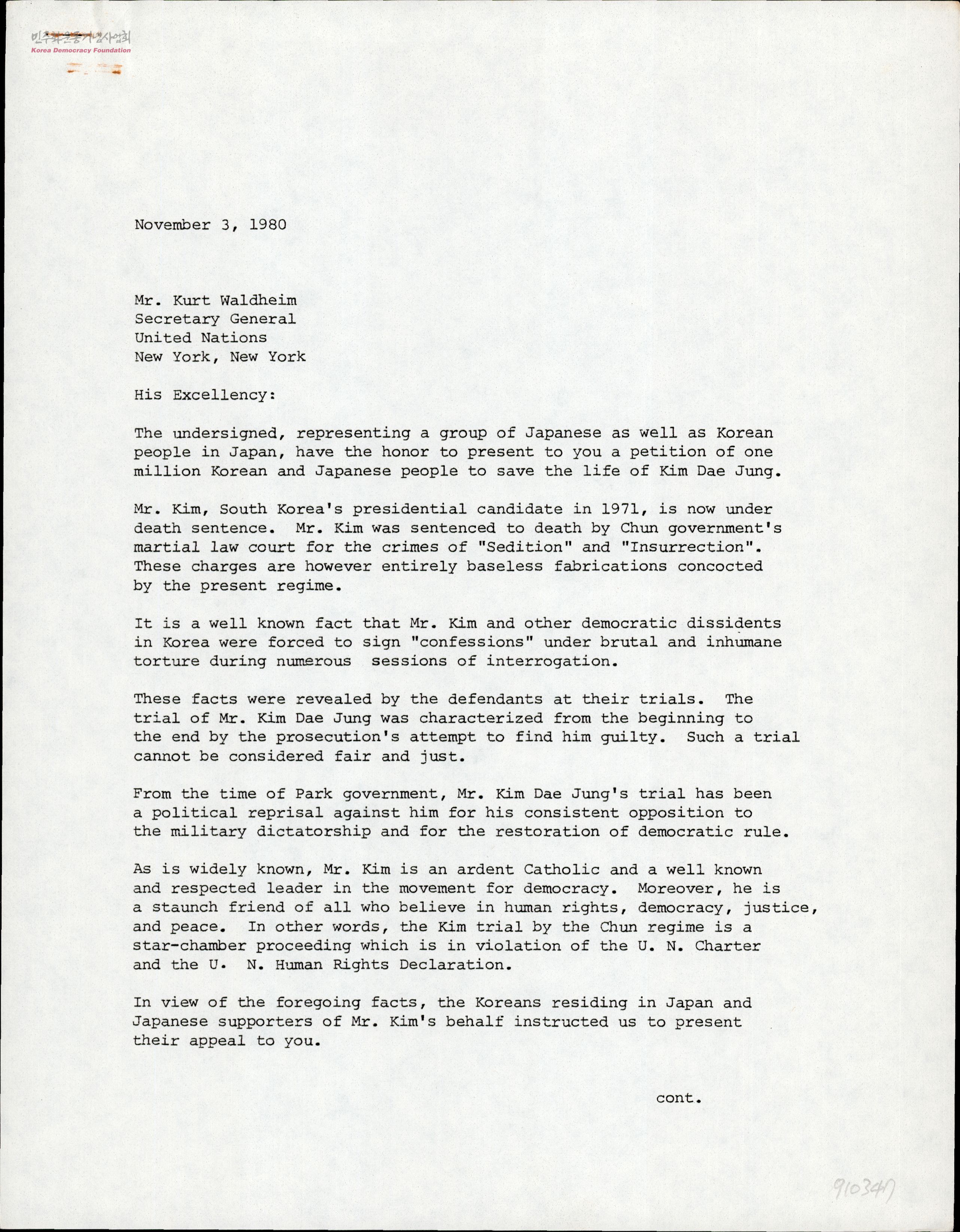 [UN 사무총장에게 김대중 구명 운동을 촉구하는 서한]