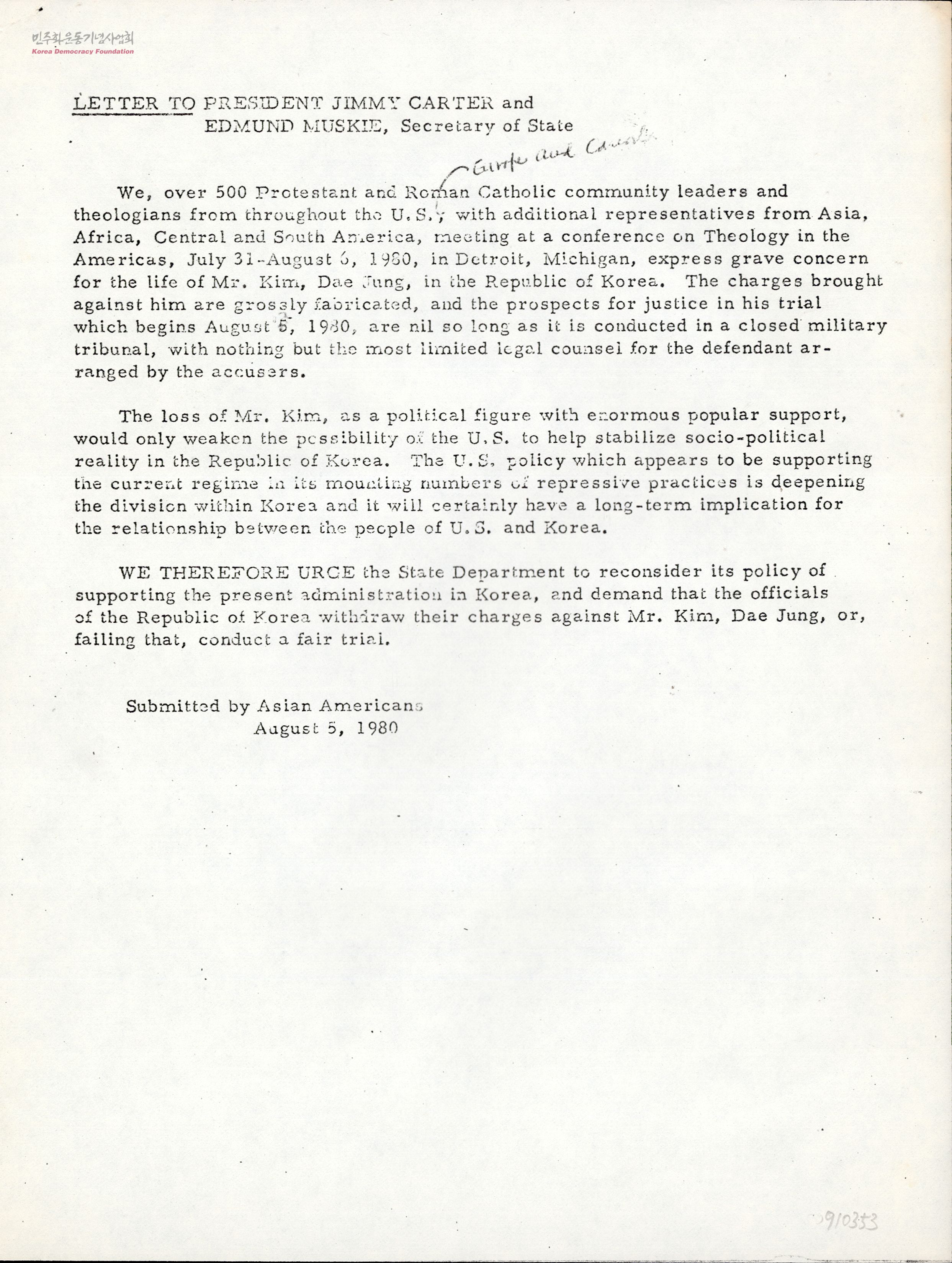 - - 1980년 7월 31일부터 8월 6일에 걸쳐 세계 각국의 개신교-카톨릭 단체 지도자들이 김대중 사면 서명운동을 진행했다는 내용. - 미 행정부가 김대중 석방을 위해 노력해줄 것을 청원