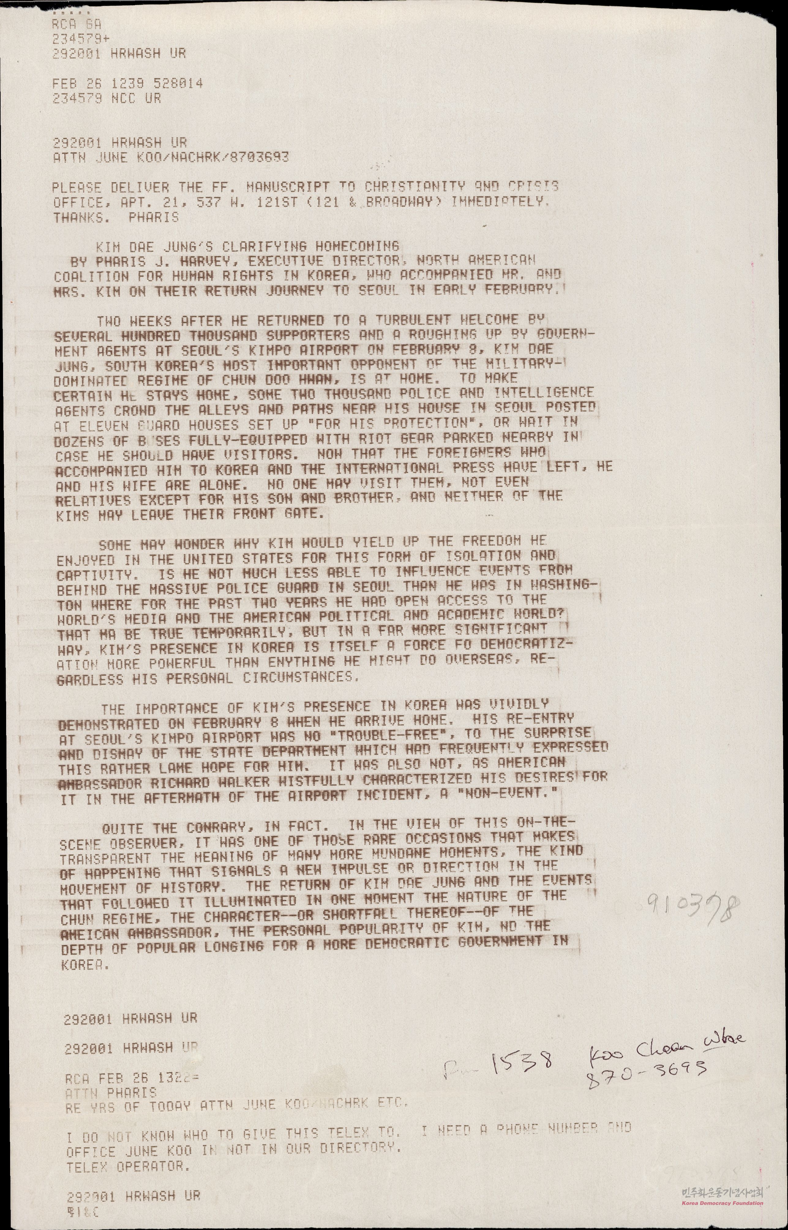 - 김대중 귀국 직후, 김포공항 강제구인-가택연금 사태의 전개과정과 한국 전두환 정권과 미 정부와 인권단체의 대응 등에 관해 North American Coalition for Human Rights in Korea의 Pharis J. Harvey가 작성한 보고서를 NCC의 한국 멤버가 정리하여 NCC 미국지부에 긴급회람을 요청하며 송신한 전보문