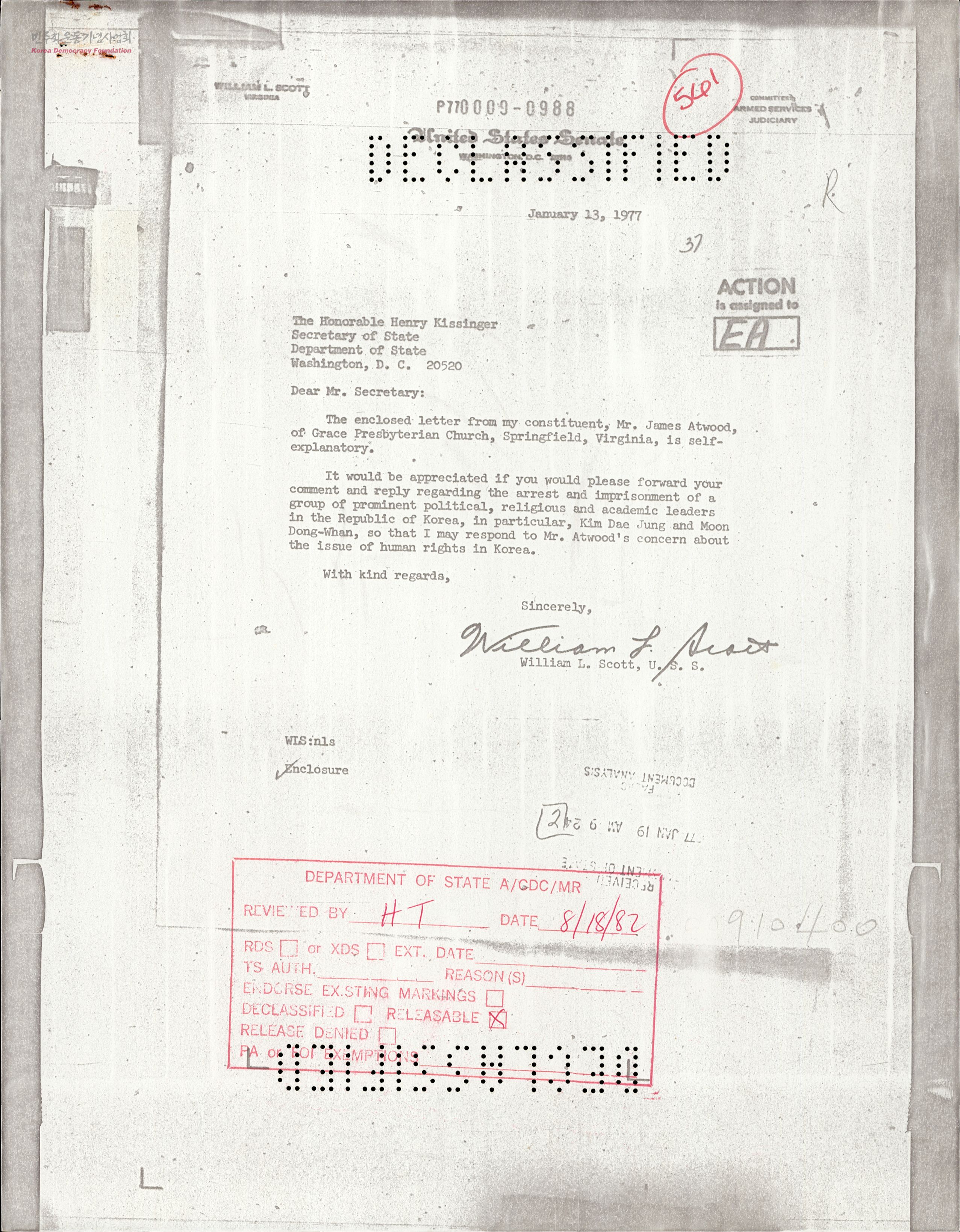 - 미 상원의원 William L. Scott이 미 국무부 장관 Henry Kissinger에게 보내는 서한으로, 미 장로교단에서 인권문제를 담당하는 James Atwood가 William L. Scott에게 보낸 한국의 김대중 체포와 각종 인권탄압 사례 등을 열거하며 김대중 구명을 위한 관련정보 문서가 동봉됨.