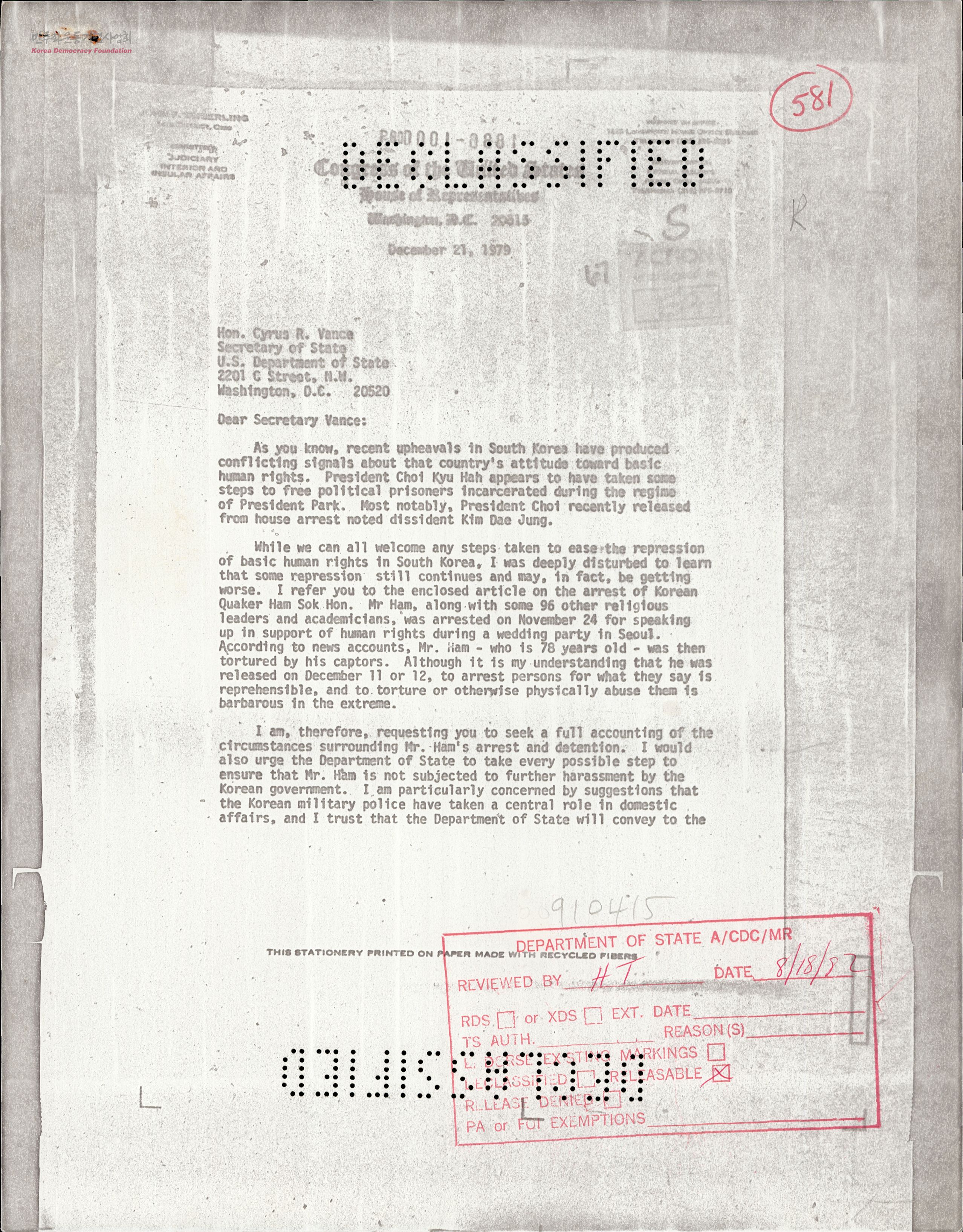 - 미 하원의원 John F. Seiberling이 미 국무장관 Cyrus R. Vance에게 보내는 서한으로 10.26 사건 이후 최규하 정권 하의 인권정책에 대한 우려와 대통령 직선제를 요구하며 일어난 YWCA 위장결혼식 사건으로 수감된 함석헌의 사례를 들며 한국 민주주의의 완전회복을 위한 미국의 원조가 필요함을 알리는 청원.
