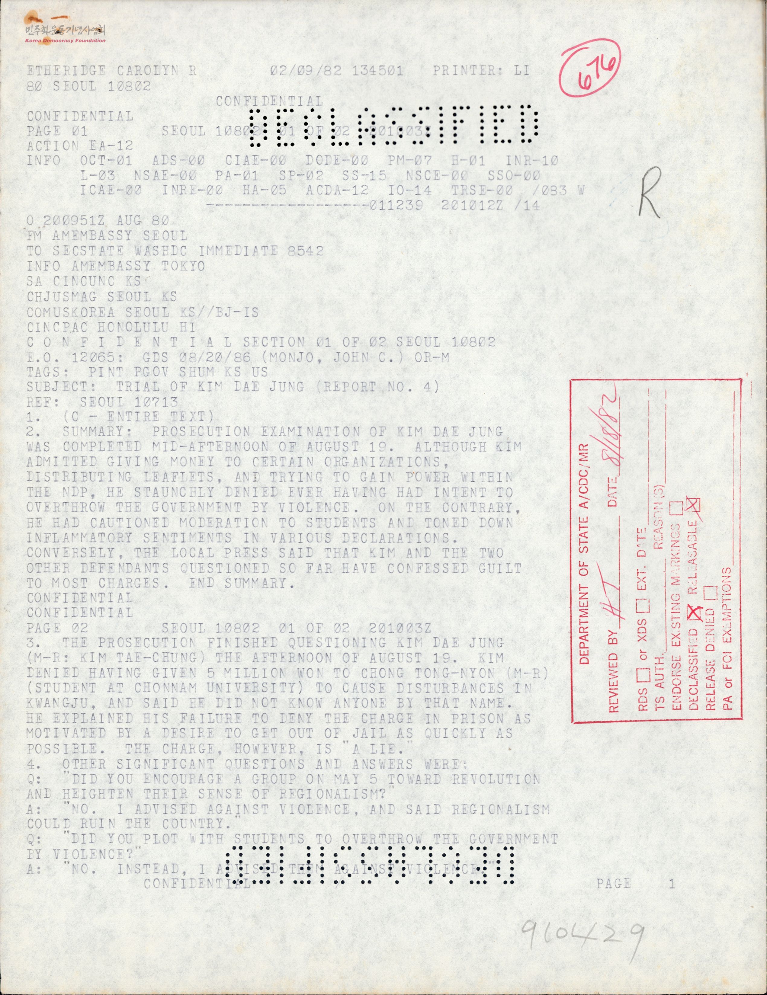 - 주한미대사관이 '김대중 내란음모사건' 관련 미 국무부에 보내는 전문으로 1980년 8월 19일, 계엄 군사법정에서의 김대중과 내란음모 관련 피의자 24명에 대한 1차 피의자 심리 과정이 묘사됨. 전문은 김대중이 '좌경학생 운동권을 동원하여 광주사태 유발 등 일련의 내란 획책혐의'를 주장하는 검찰의 주장에 대해 반박했으나 피의자 의견이 무시되었고 이러한 분위기로 보아 해당 사건의 1차 공판 판결은 김대중 사형 등 관련자들에 대한 중형이 이미 결정된 사안일 것이라는 주한미대사관의 보고.