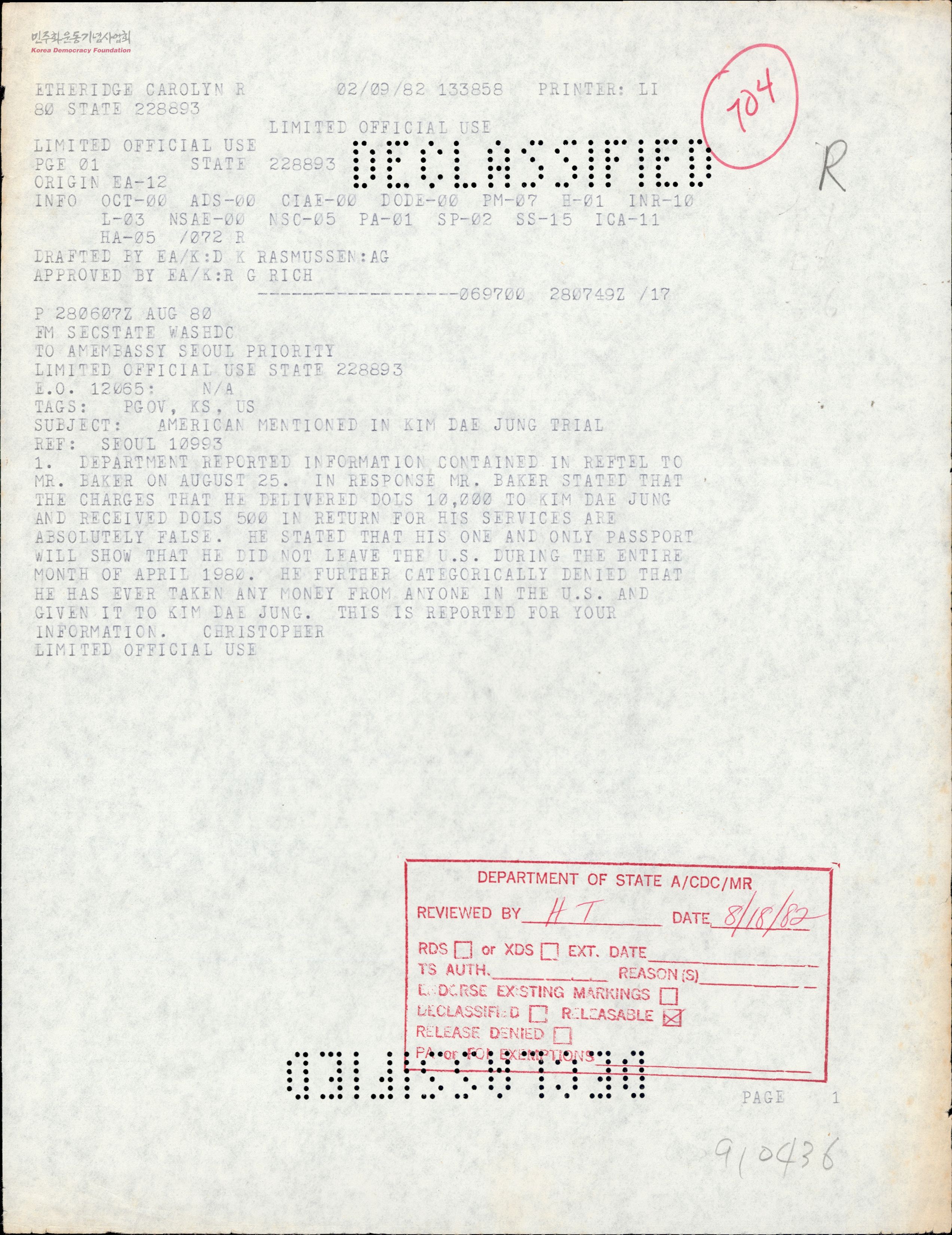 - 미 국무부가 '김대중 내란음모사건' 공판 관련 주한미대사관에 보내는 전문으로 김대중 내란음모 공판에서 제기된 미국인 베이커의 김대중에 대한 1만불 제공설은 전혀 사실무근의 거짓으로 판명되었다는, 주한미대사의 질의에 대한 국무부의 답변.