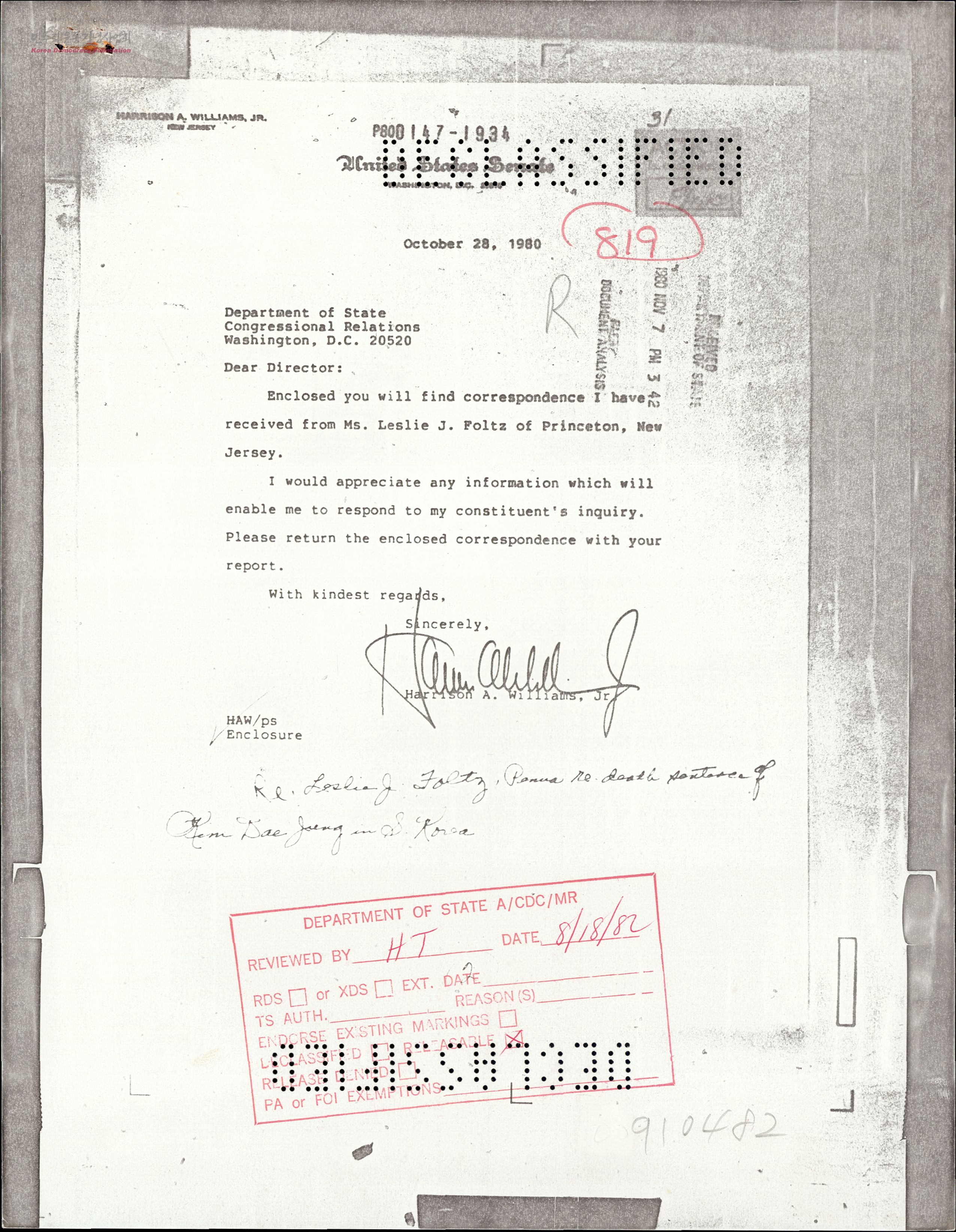 - 미 상원의원 Harrison A. Williams, Jr.가 국무부에 전송한 서한으로 Lesile J.falts의 김대중 사형선고에 대한 인권단체 회원의 국무부 해리슨 윌리엄스에로의 사면청원서가 동봉.