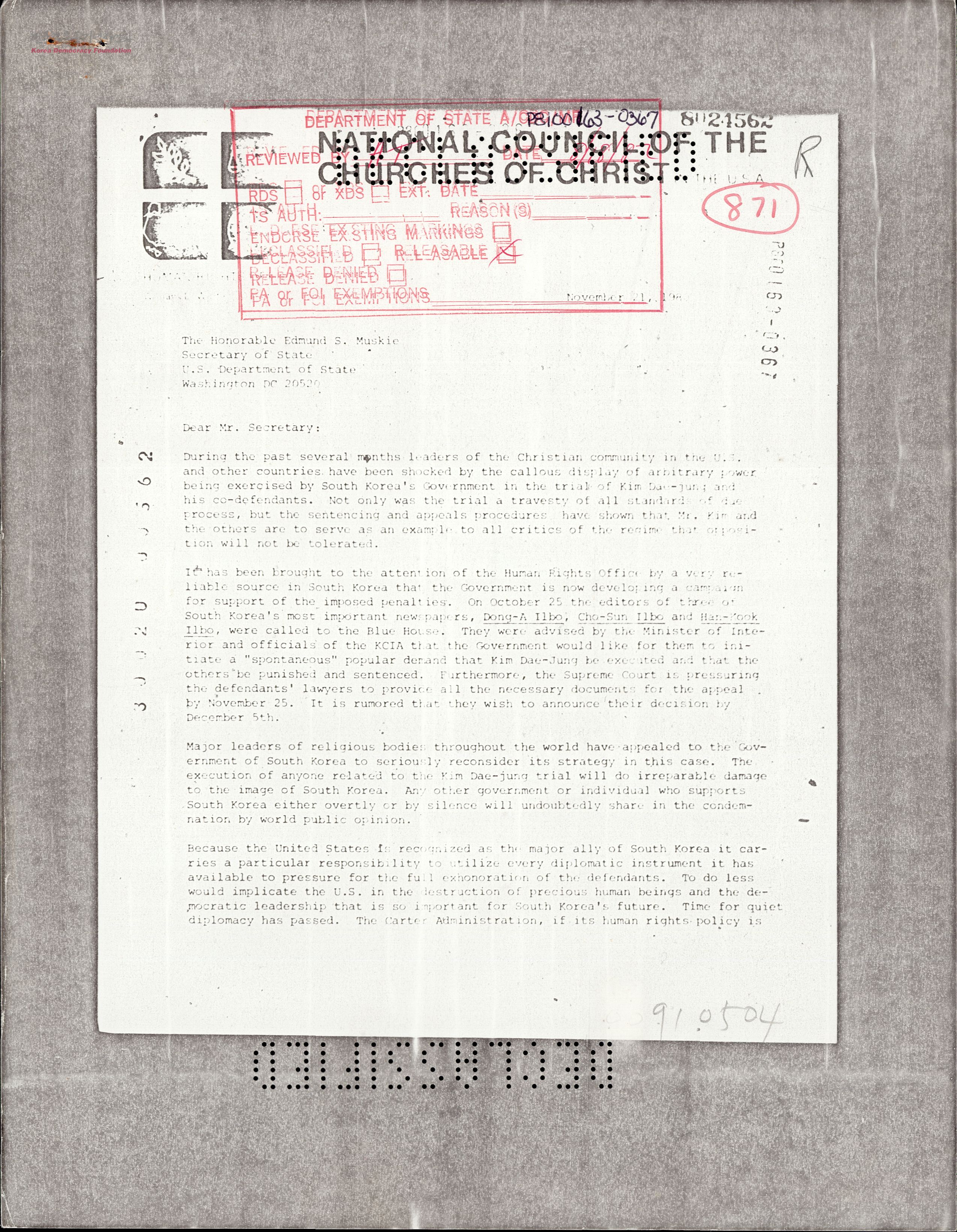 - NCCC William L. Wipfler가 국무장관 Edmund Muskie에 보낸 김대중 사면활동 촉구 청원서로 김대중 사형선고와 내란음모 재판, 한국 독재체제의 인권침해를 설명하고, 이에 대한 미 정부의 역할을 기대한다는 내용.