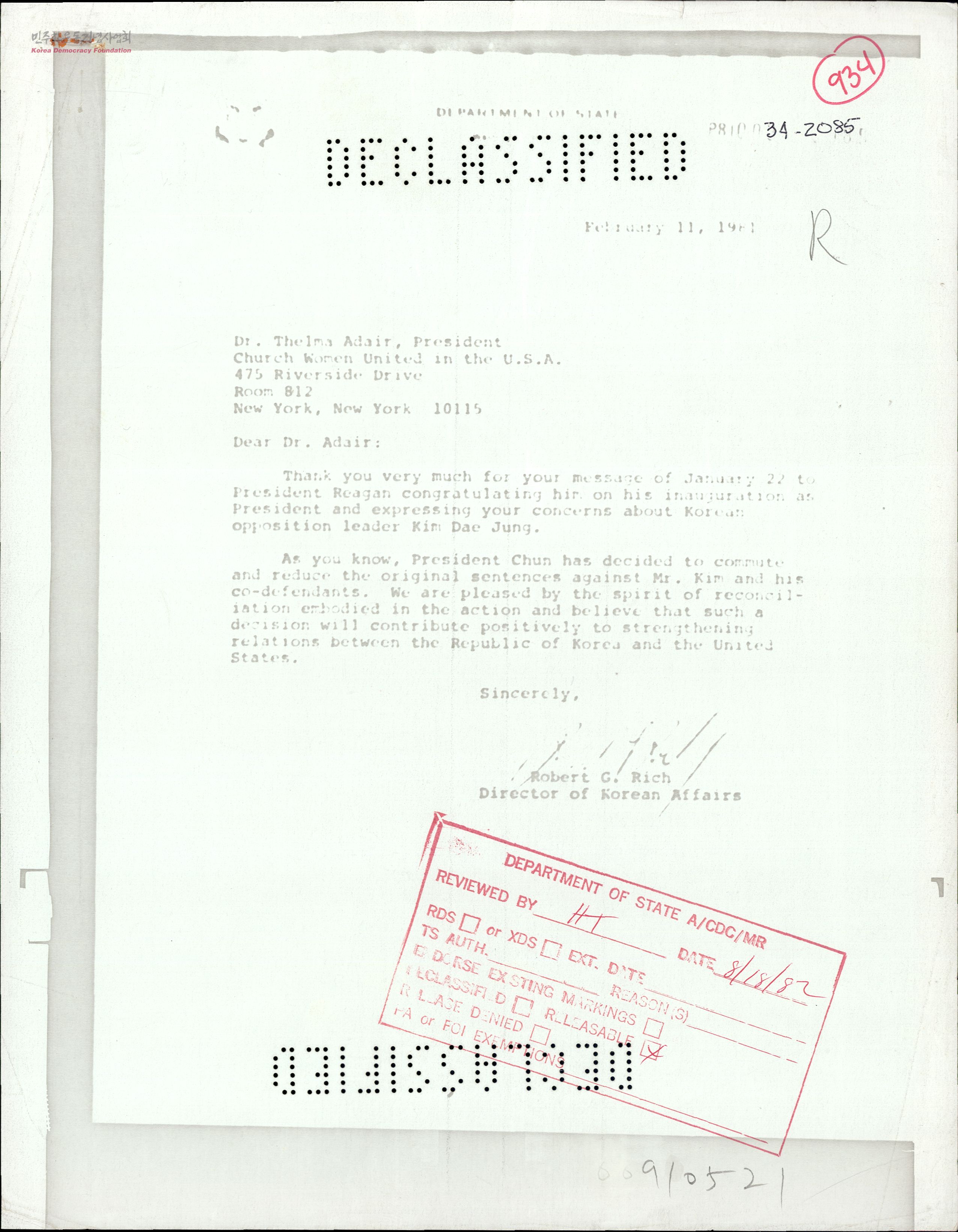 - 미 국무부 한국과장 Robert G. Rich가 Church Women United in the U.S.A,의 회장 Thelma Adair에게 보내는 편지로 레이건 신임 대통령에게 보낸 한국 김대중 사면노력 청원서에 대해, 긴밀한 대한관계를 활용, 감형 등 여러 유화조치에 합의를 끌어내고 있다는 내용.