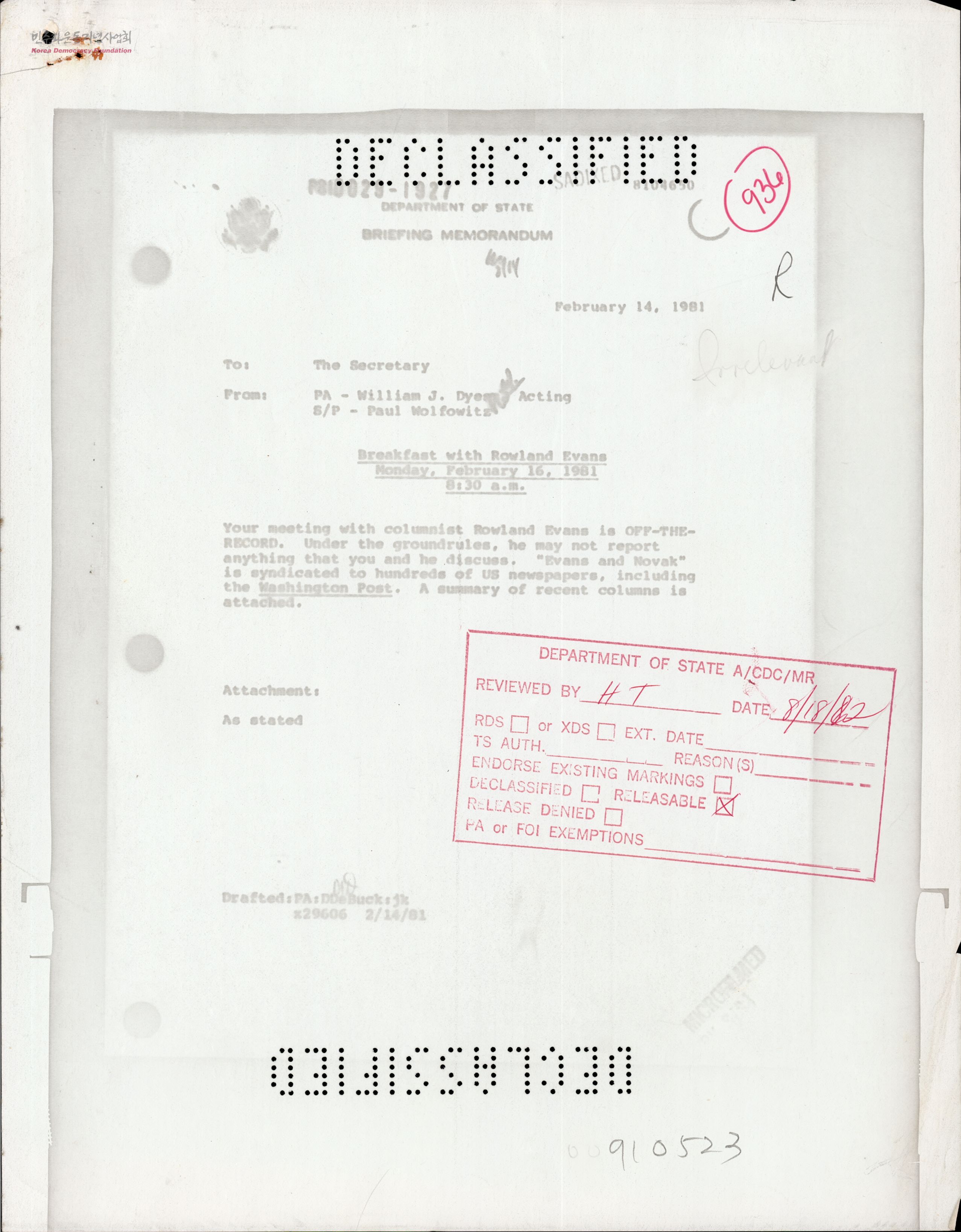- 미 국무부의 William J. Dyess와 Paul Wolfowitz가 미 국무부 장관에게 보내는 보고서로 칼럼니스트Rowland Evans와의 비공개 조찬회동을 앞두고 레이건 행정부의 향후 대외 정책 방향과 관련된 그의 칼럼을 요약, 보고하는 내용.