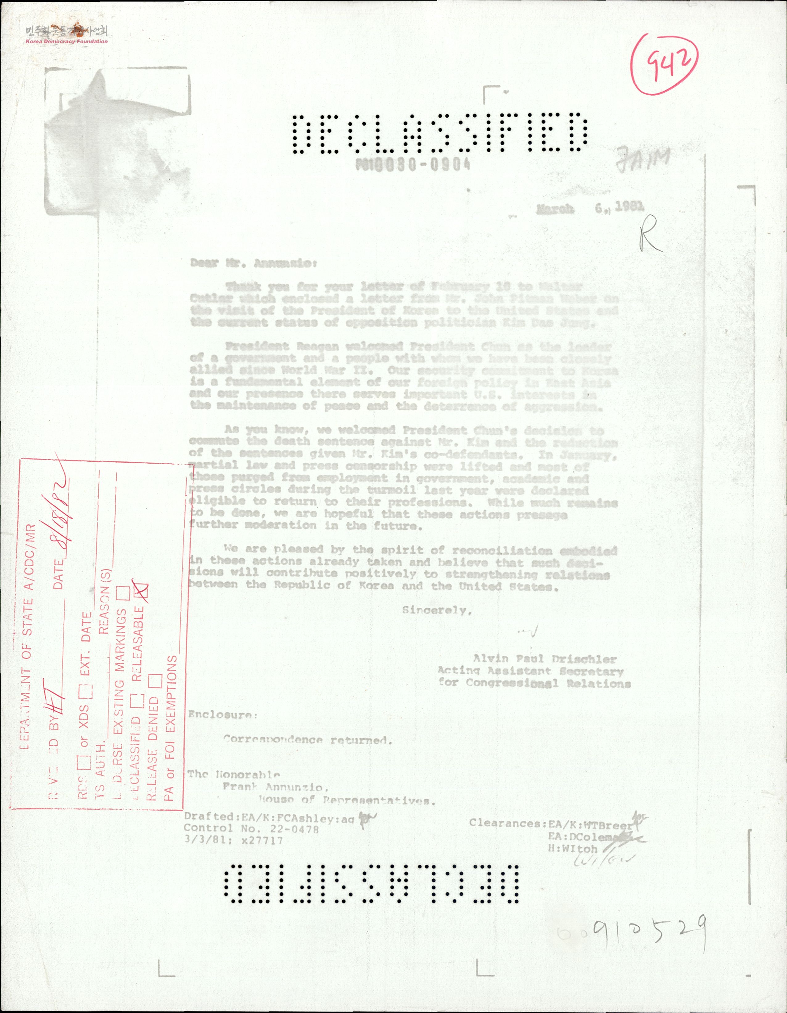 - 미 국무부 의회 담당 차관보 대리 Alvin Paul Drischler가 미 하원의원 Frank Annuzio에게 보내는 답신으로 김대중 구명촉구 요청 서한에 대해 미 정부는 한국의 독재와 민주인사 탄압문제에 인식을 같이 하고 있음을 표하고, 다양한 채널과 방법을 동원해전두환의 김대중 사면을 이끌어낼 수 있도록 힘쓰겠다는 내용.