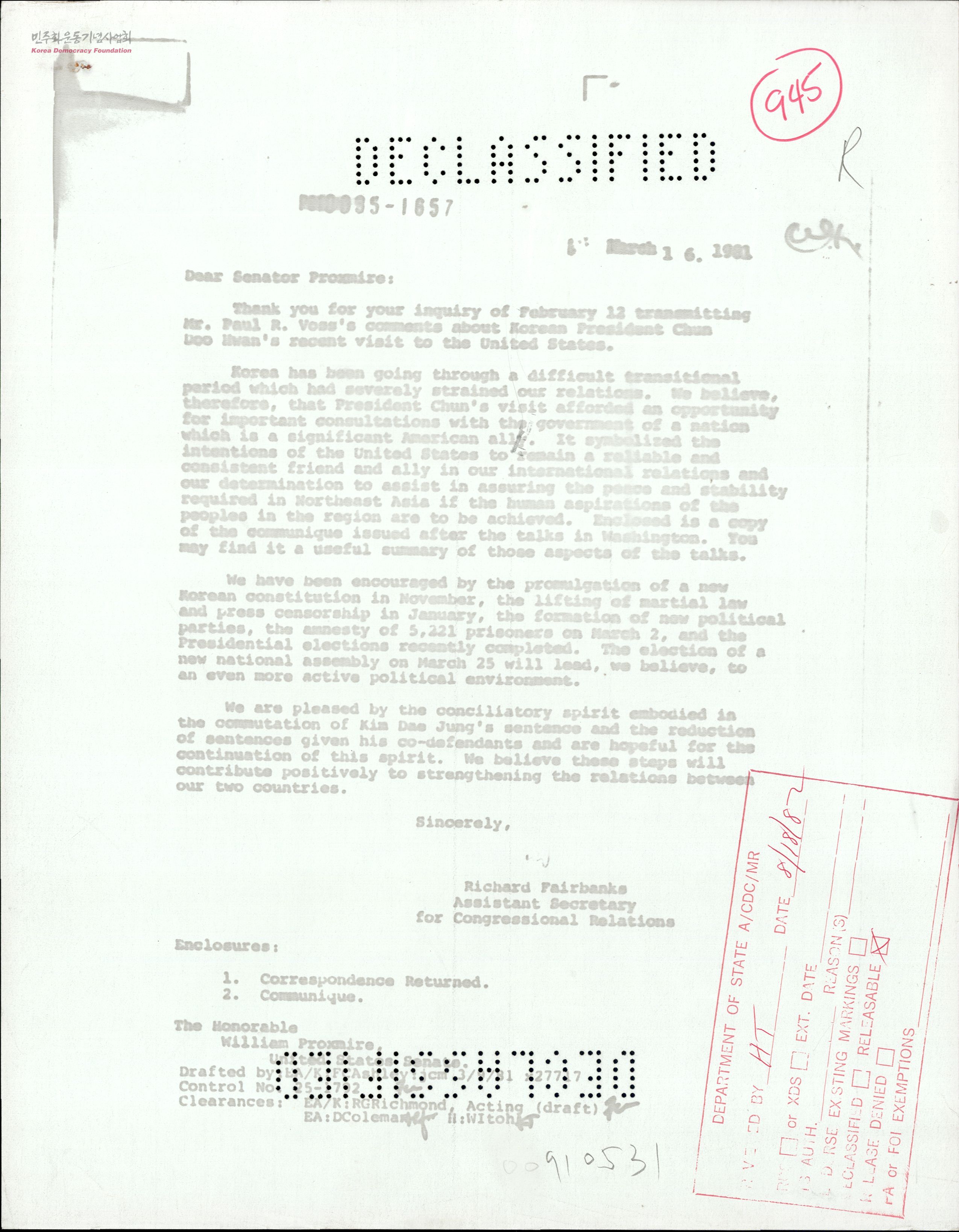 - 미 국무부 의회담당 차관보 Richard Fairbanks가 미 상원의원 William Proxmire에게 보내는 답신으로 많은 난관이 한미 정부간에 있지만, 전두환 방미를 통해 김대중의 감형조치를 이끌어내는 등 정부로선 가시적 성과를 점차 거두고 있으며, 앞으로 한국의 민주화를 위해 함께 협조하자는 서한.