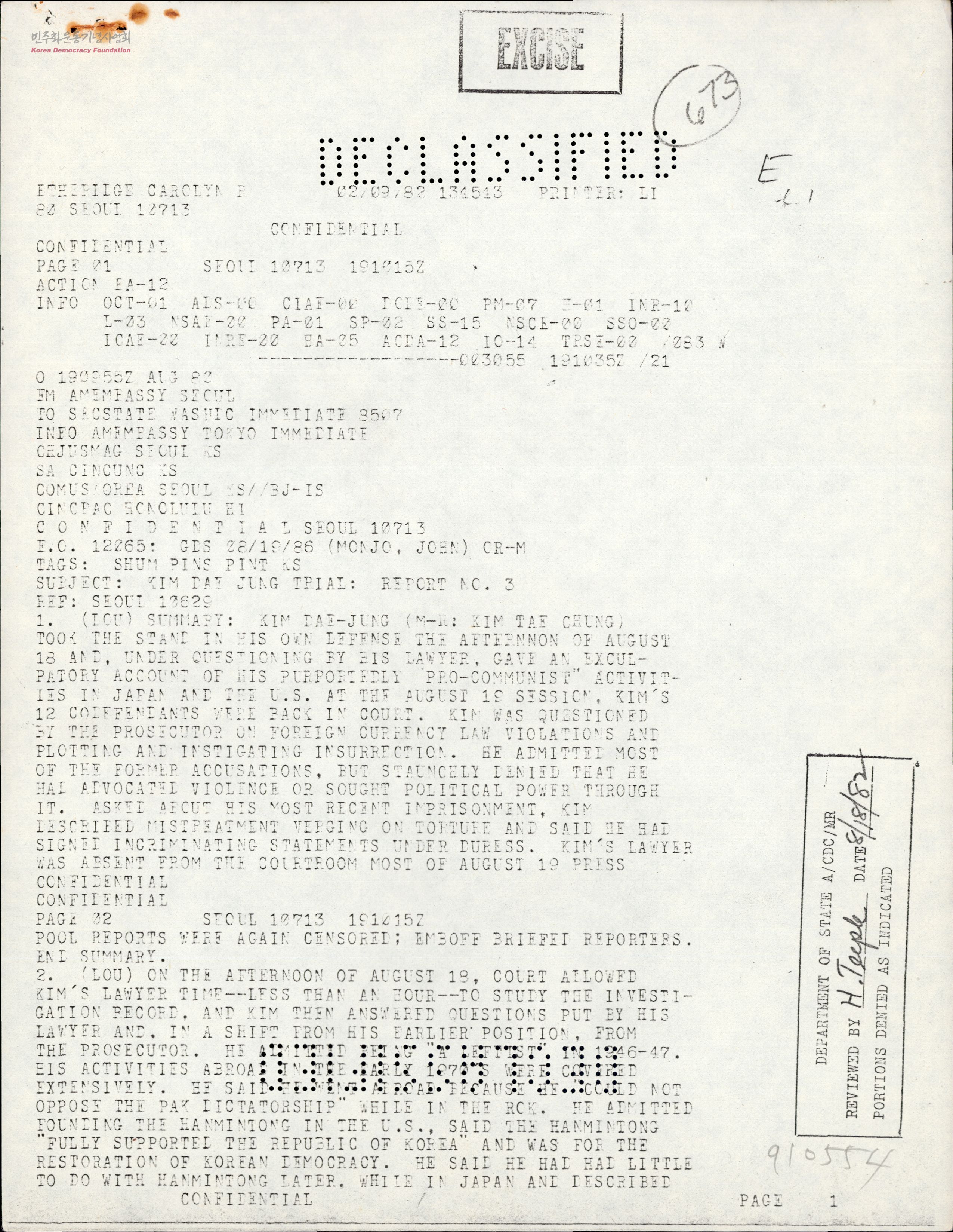 - 주한미대사관이 김대중 재판 관련 미 국무부에 보내는 전문으로 '김대중 내란음모사건' 재판 법정에서 군부 측이 채택한 증인들의 일부가 김대중을 용공주의자라는 증언을 했으나, 일본 체류시절 인권운동을 함께한 재일교포, 일본인들은김대중은 자유와 민주주의를 신봉하는 순수한 민주인사이며 증언들은 신군의 위협과 폭압, 회유에 의해 조작된 것이라 반박하고 있다는 내용