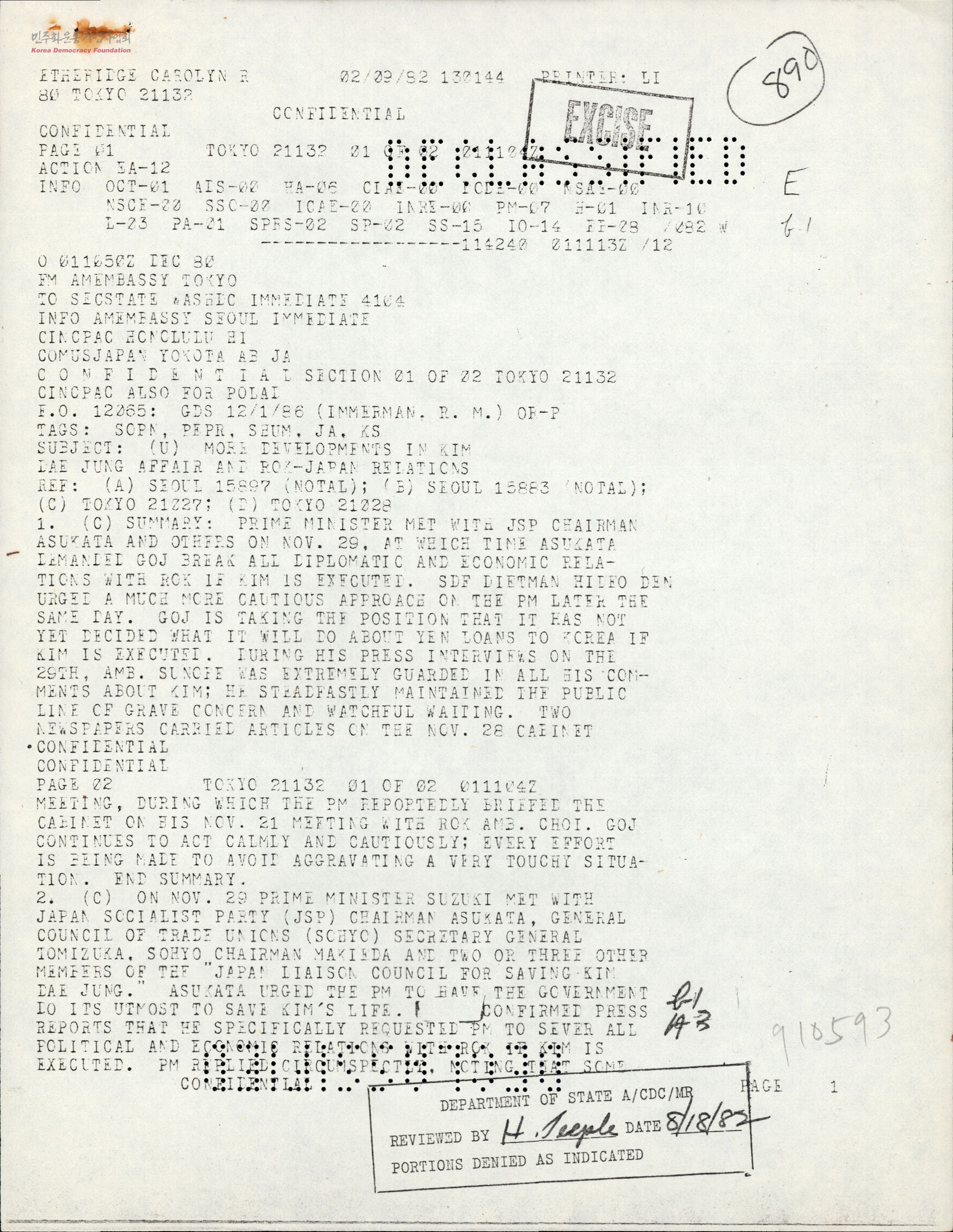 - Suzuki Zenko 일본수상이 일본사회당 Asutaka Ichio 당수와의 만남에서 만약 김대중이 처형된다면, 외교-경제부문을 포괄한 한일관계의 모든 부문에서 심각한 상황이 올 것임을 명확히 했고, 향후 여야가 협력하여김대중 구명과 한국 민주주의 진전을 위해 협력해 갈 예정이라는 산케이, 요미우리 등 일본 언론보도를 인용한 정보 보고서.