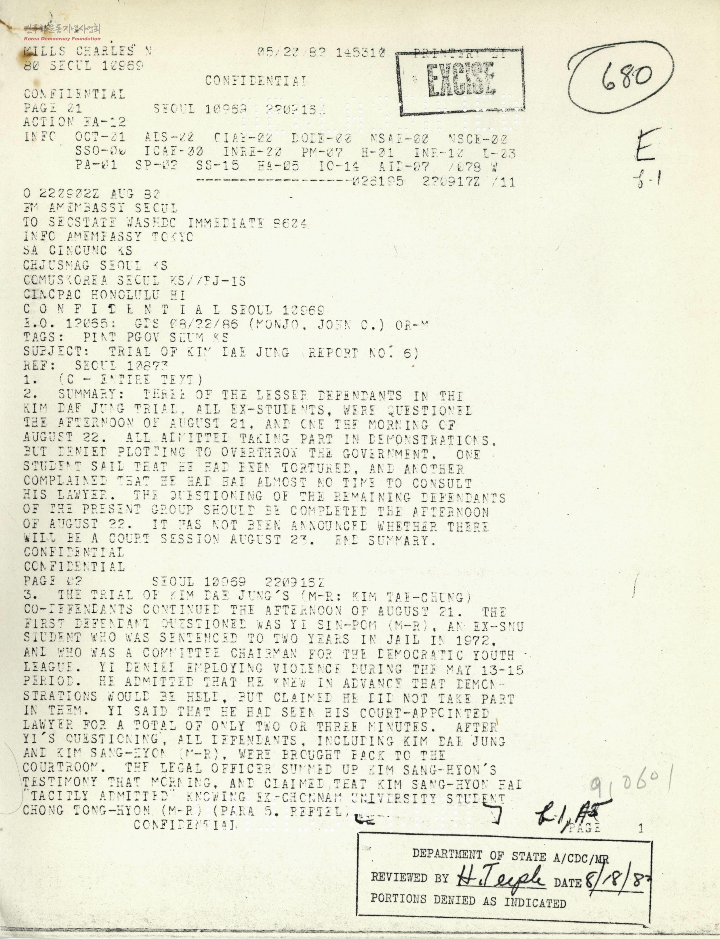- 주한미대사관이 김대중 재판 관련 미 국무부에 보내는 전문으로 1980년 8월의 군사법정에서의 김대중과 '내란음모사건' 피의자 23명에 대한 공판이 있었고, 피의자들의 강력한 혐의 부인에도 불구하고 단시간만에 공판은 유죄의 방향으로 확정되었다는 전보문.