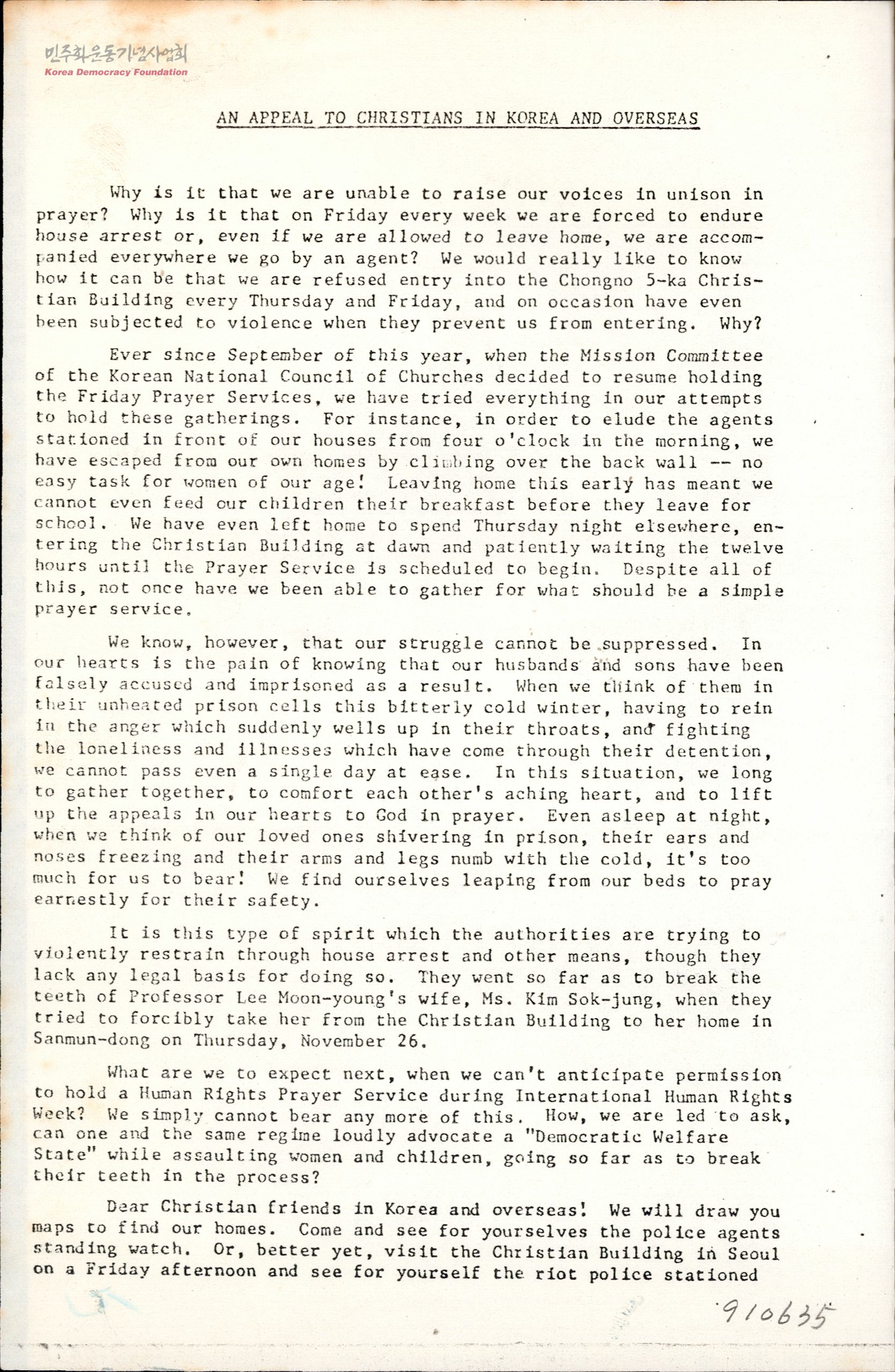- 1980년 9월의 김대중 사형선고를 비롯한 '김대중 내란음모사건' 피의자들에 대한 중형선고의 부당성과 신군부의 민주화 말살을 고발 및 규탄하는 피의자 가족들의 한국과 해외 기독교 인권단체들에 대한 호소문.