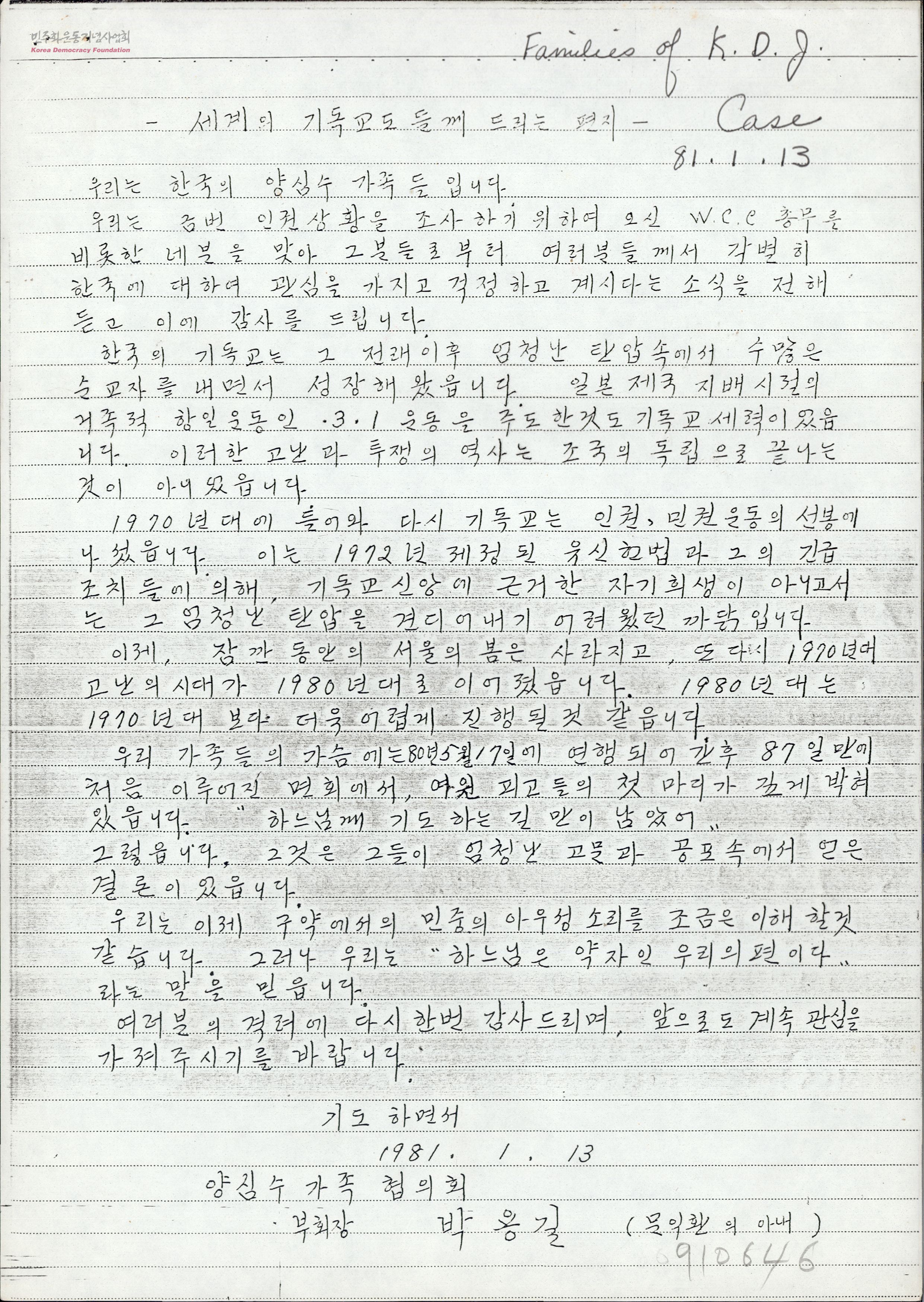 - 전두환 독재치하에서 수감된 양심수 가족의 대표이자 한국 기독교인으로서 세계 기독교 단체들의 김대중 구명 등 민주화 지원에감사의 뜻을 표하고, 신군부 정권 아래에서 자행되고 있는 정치범 투옥, 언론통폐합, 노동계-종교계 탄압 등 인권말살의 실태를 발표
