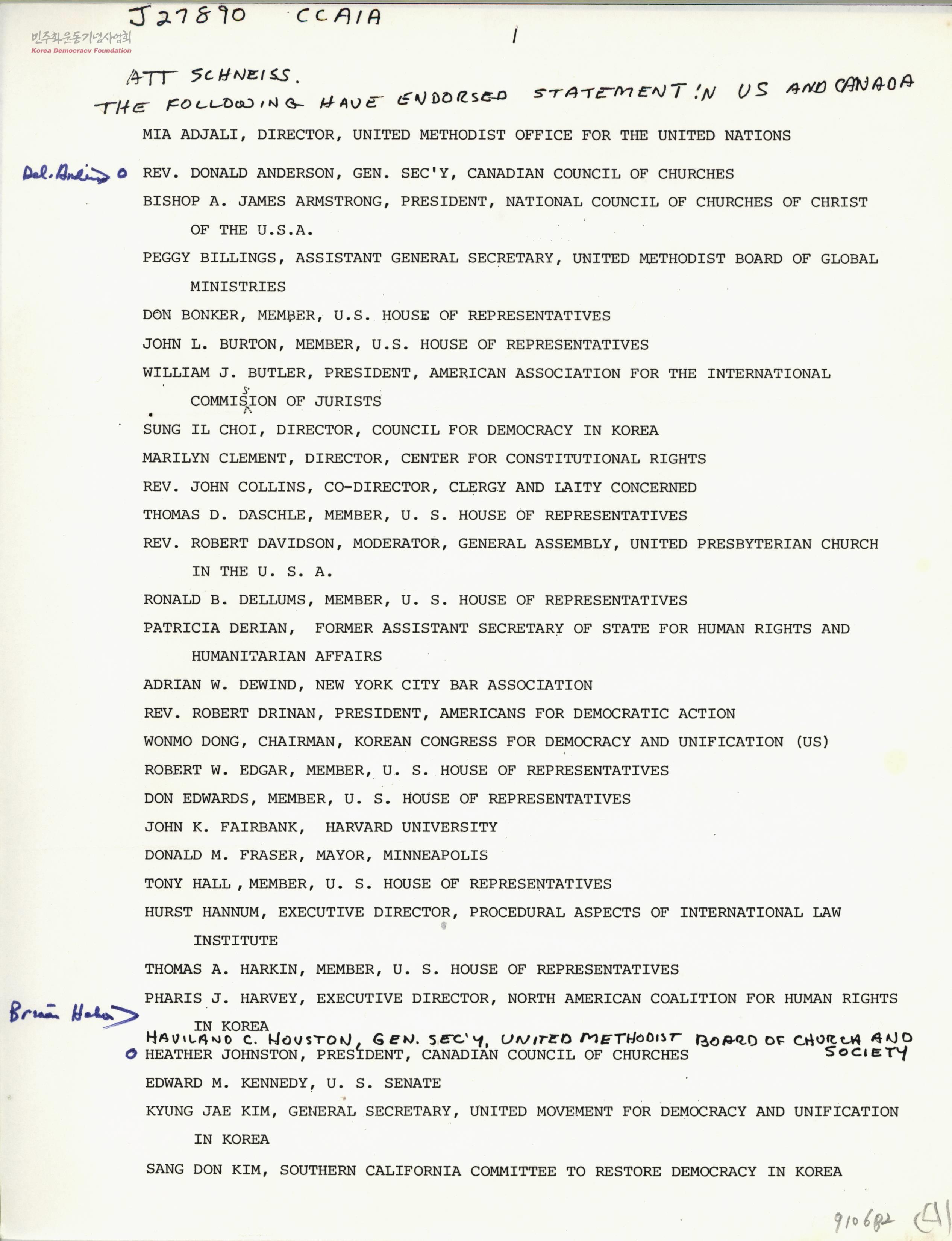 - 미국, 한국, 캐나다, 기타 아시아 각국의 카톨릭-개신교 김대중 구명운동 참가자 명단