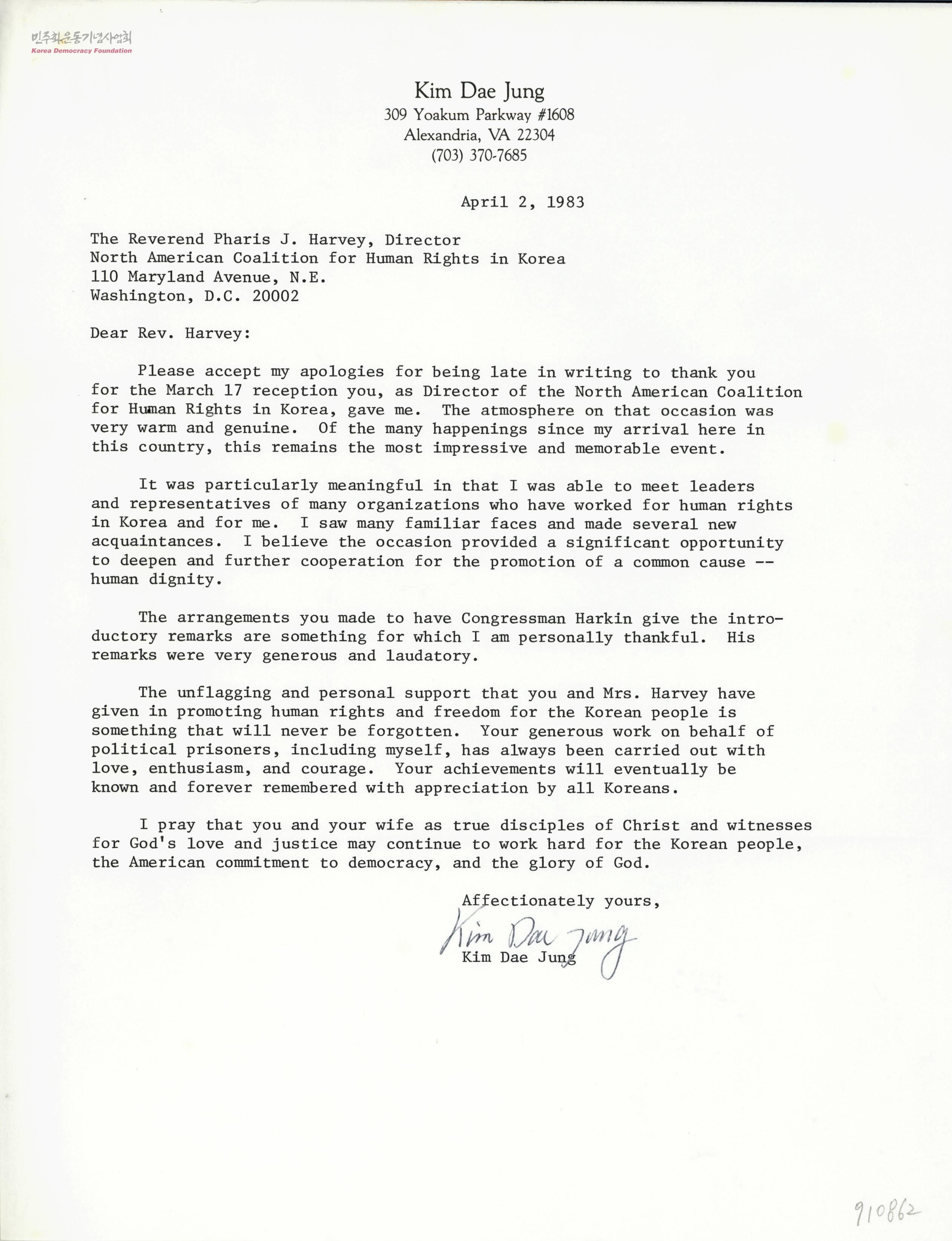 North American Coalition for Human Rights in Korea의 Pharis J. Harvey에게 보내는 김대중의 감사 편지