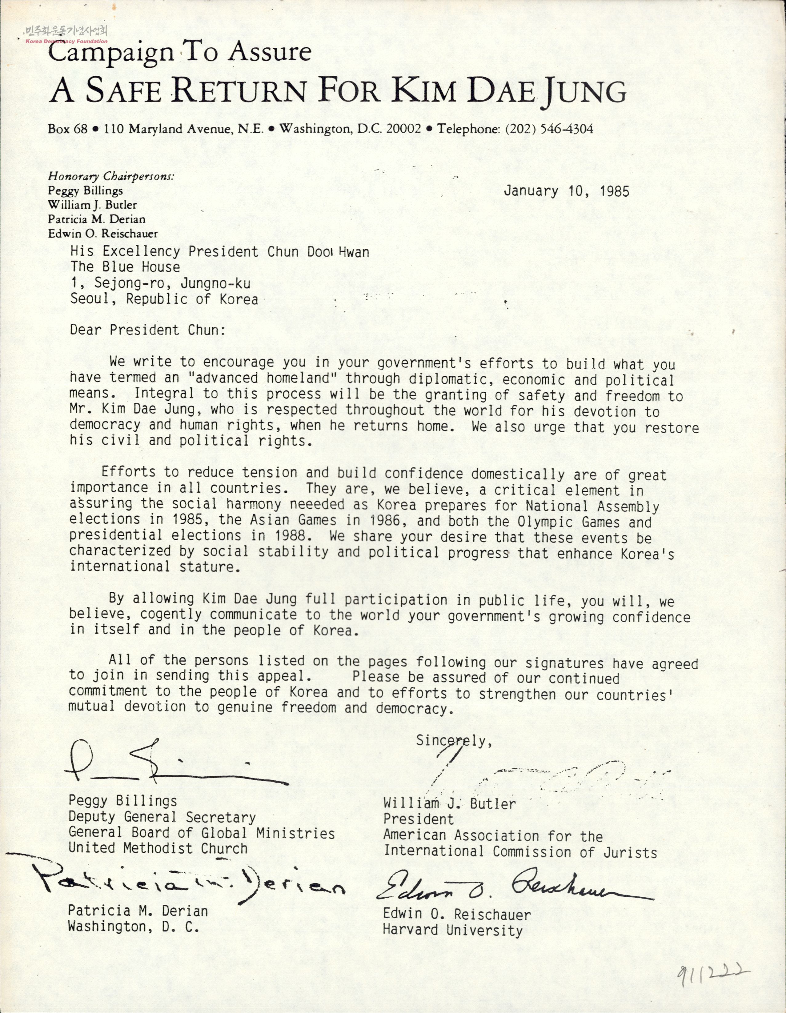 - Campaign To Assure-A Safe Return For Kim Dae-Jung이 전두환에게 김대중의 안전과 자유, 정치적 권리 회복 등을 촉구하며 보낸 청원서와 서명 참가자 목록