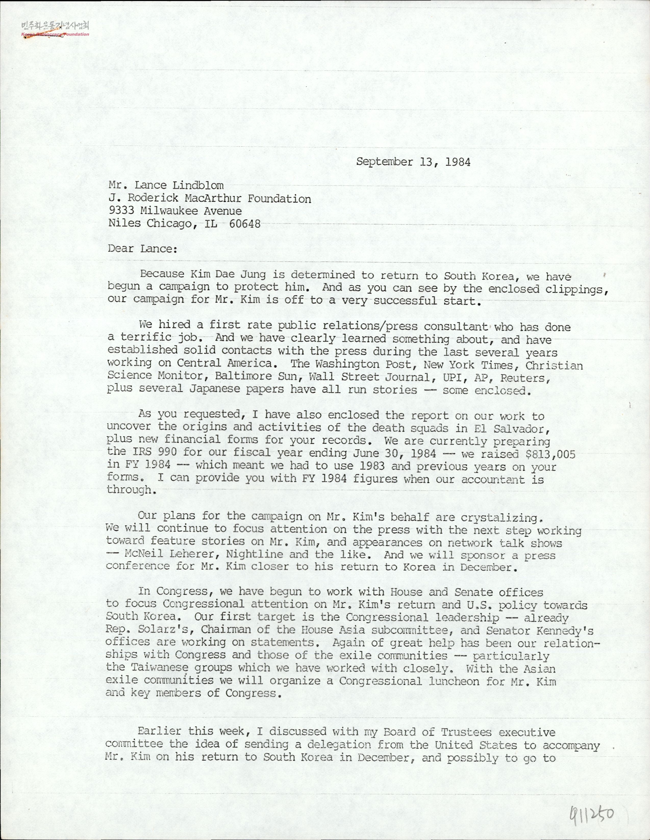 Center for Development Policy의 Lindsay Mattison이 J. Roderick MacArthur Foundation의 Lance E. Lindblom 회장에게 보낸 김대중 안전귀국 캠페인 소요예산 관련 편지