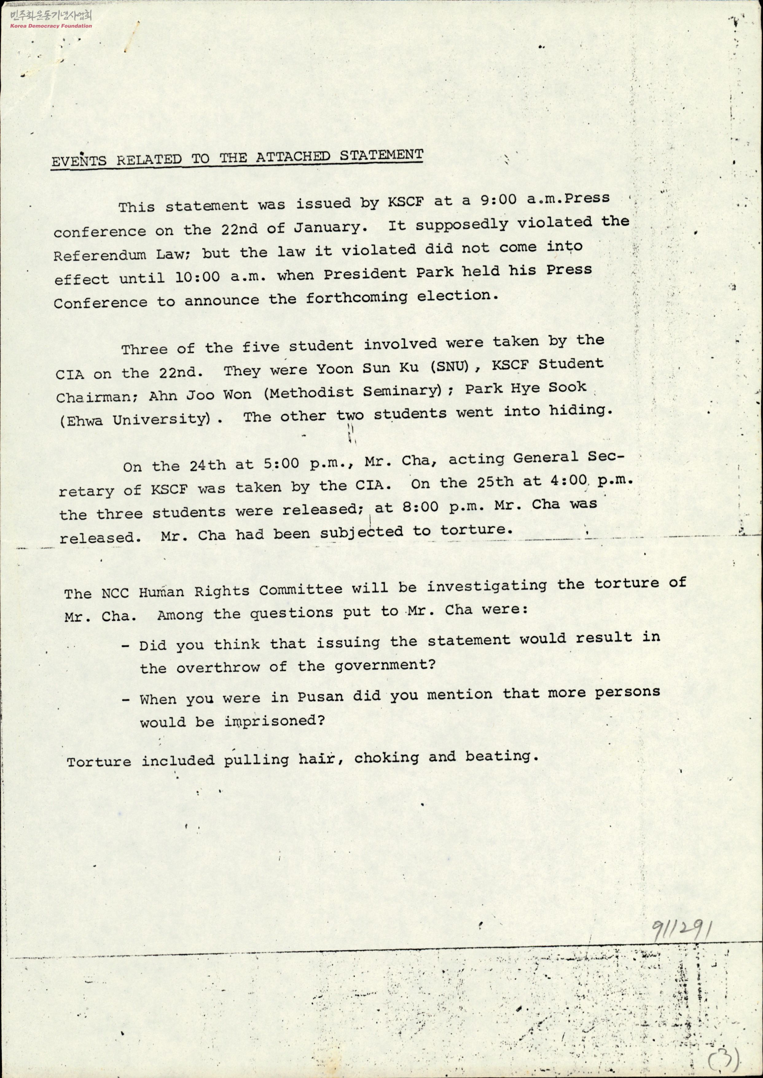 - KSCF에서 발표한 성명서와 관련된 서한으로 KSCF 회장 윤선구와 회원 안주원, 박혜숙 등의 연행 소식을 알리고, 간사 차선각의 고문 사실을 폭로하는 내용.